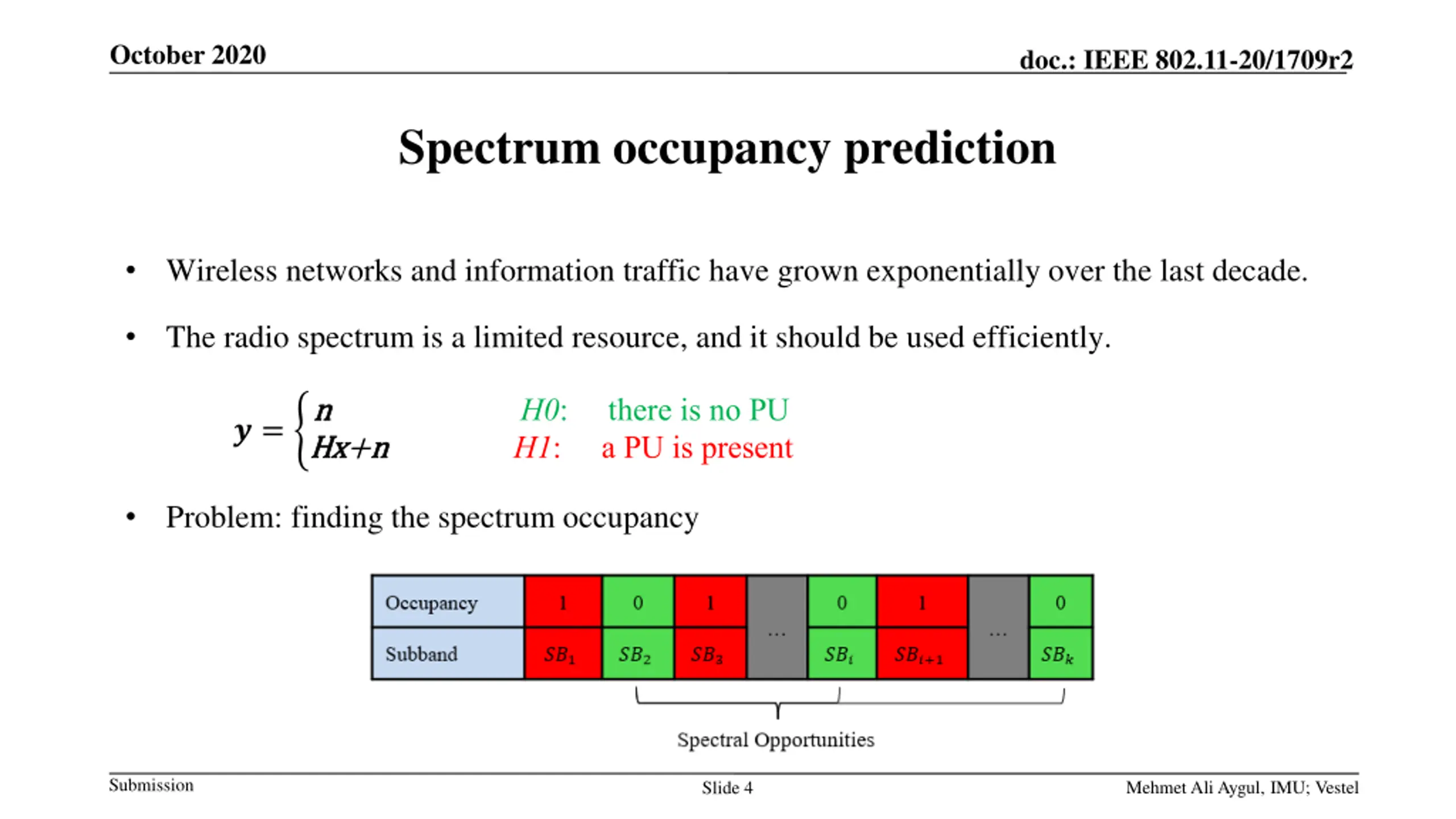 October 2020 doc.: IEEE 802.11-20/1709r2 Spectrum occupancy prediction Wireless networks and information traffic have grown exponentially over the last decade. The radio spectrum is a limited resource, and it should be used efficiently. ? = n n H0: H1: there is no PU a PU is present Hx Hx+n n Problem: finding the spectrum occupancy Submission Mehmet Ali Aygul, IMU; Vestel Slide 4