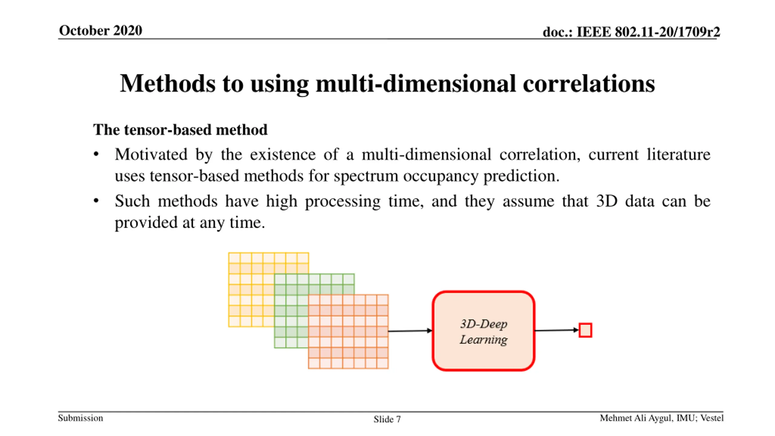 October 2020 doc.: IEEE 802.11-20/1709r2 Methods to using multi-dimensional correlations The tensor-based method Motivated by the existence of a multi-dimensional correlation, current literature uses tensor-based methods for spectrum occupancy prediction. Such methods have high processing time, and they assume that 3D data can be provided at any time. Submission Mehmet Ali Aygul, IMU; Vestel Slide 7