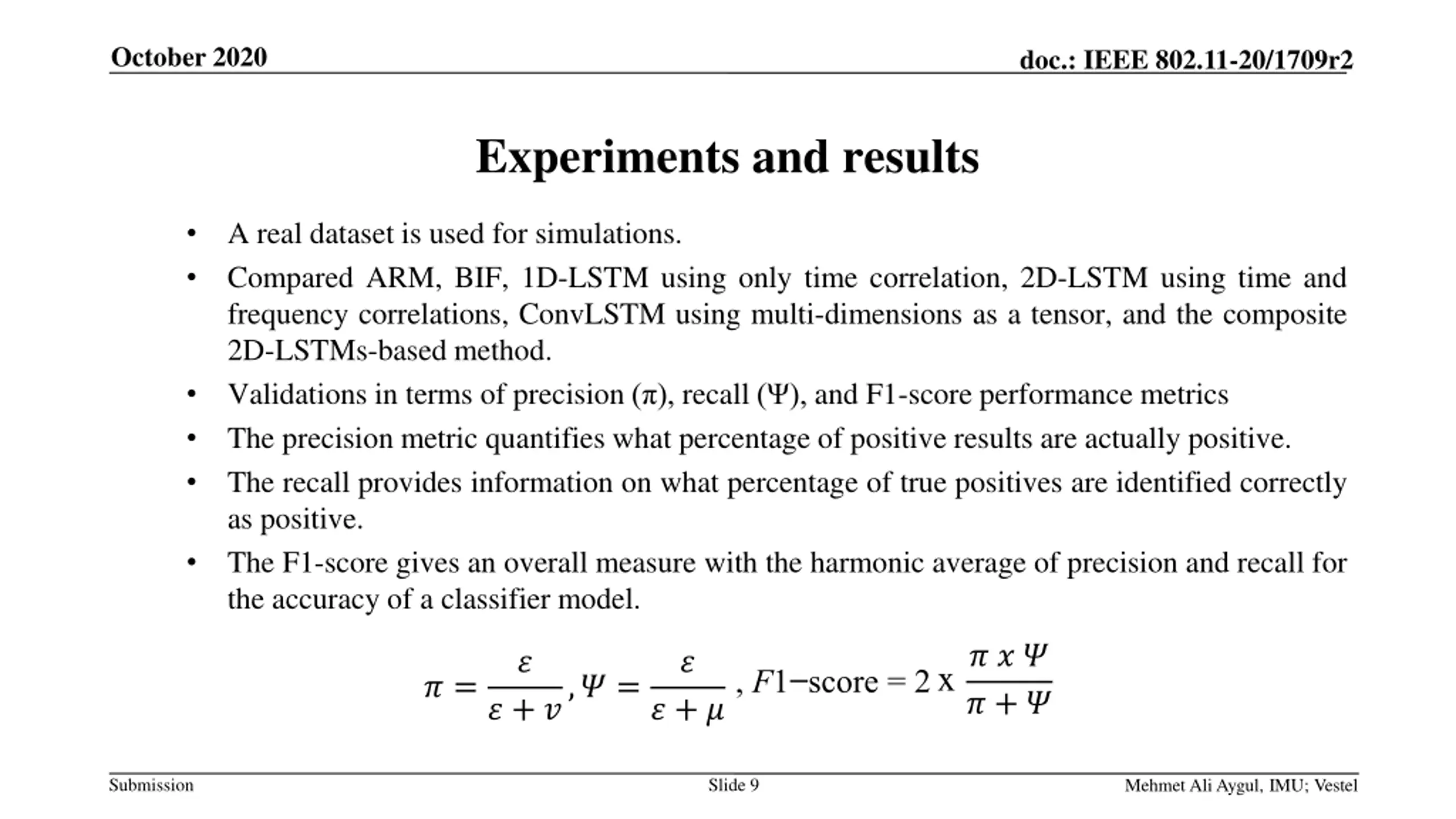 October 2020 doc.: IEEE 802.11-20/1709r2 Experiments and results A real dataset is used for simulations. Compared ARM, BIF, 1D-LSTM using only time correlation, 2D-LSTM using time and frequency correlations, ConvLSTM using multi-dimensions as a tensor, and the composite 2D-LSTMs-based method. Validations in terms of precision ( ), recall ( ), and F1-score performance metrics The precision metric quantifies what percentage of positive results are actually positive. The recall provides information on what percentage of true positives are identified correctly as positive. The F1-score gives an overall measure with the harmonic average of precision and recall for the accuracy of a classifier model. ? ? ? ? + ? ? ? x , F1 score = 2 ? = ? + ?,? = ? + ? Submission Slide 9 Mehmet Ali Aygul, IMU; Vestel