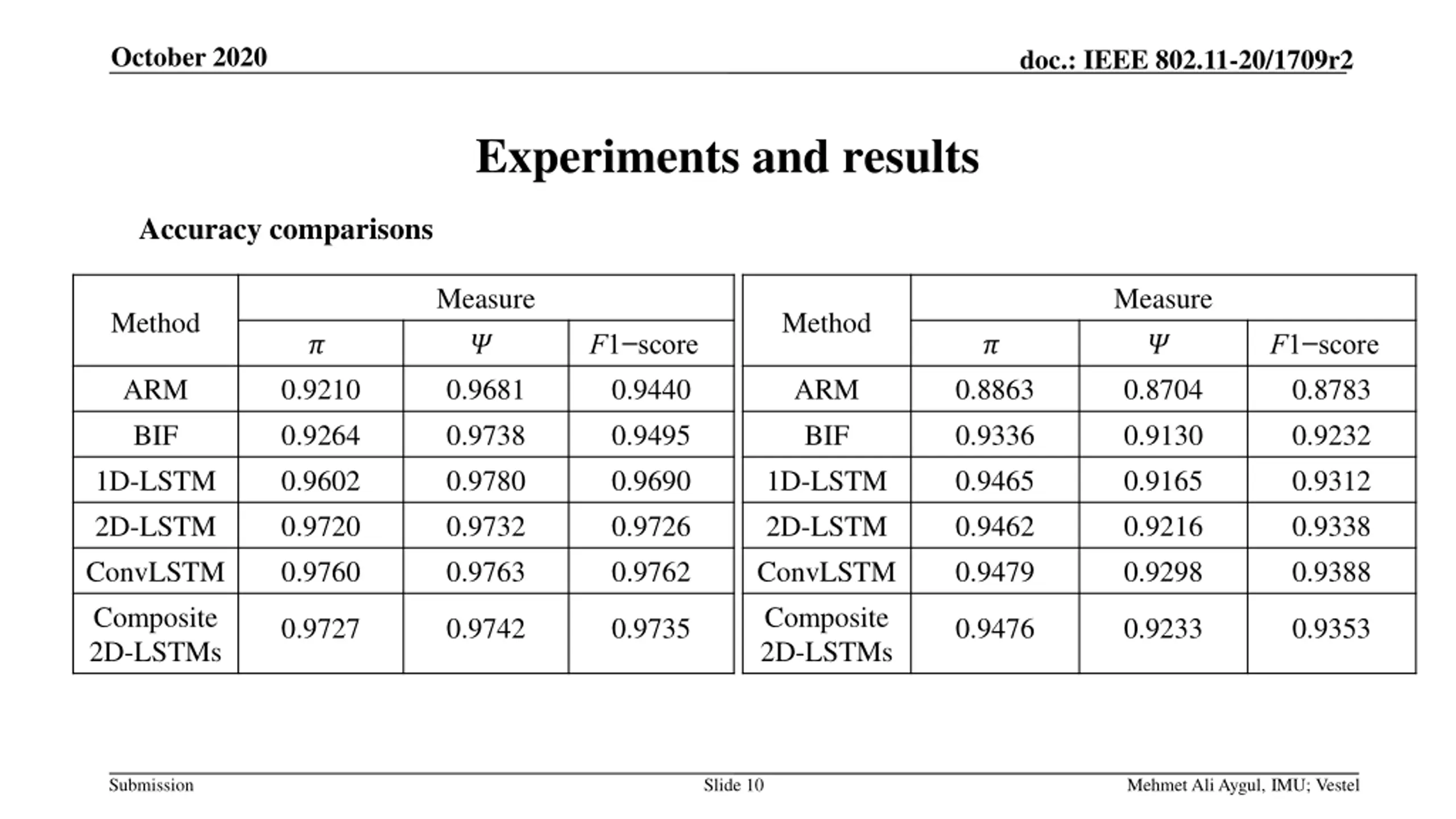 October 2020 doc.: IEEE 802.11-20/1709r2 Experiments and results Accuracy comparisons Measure Measure Method Method F1 score 0.9440 0.9495 0.9690 0.9726 0.9762 F1 score 0.8783 0.9232 0.9312 0.9338 0.9388 ? ? ? ? ARM BIF 1D-LSTM 2D-LSTM ConvLSTM Composite 2D-LSTMs 0.9210 0.9264 0.9602 0.9720 0.9760 0.9681 0.9738 0.9780 0.9732 0.9763 ARM BIF 1D-LSTM 2D-LSTM ConvLSTM Composite 2D-LSTMs 0.8863 0.9336 0.9465 0.9462 0.9479 0.8704 0.9130 0.9165 0.9216 0.9298 0.9727 0.9742 0.9735 0.9476 0.9233 0.9353 Submission Slide 10 Mehmet Ali Aygul, IMU; Vestel
