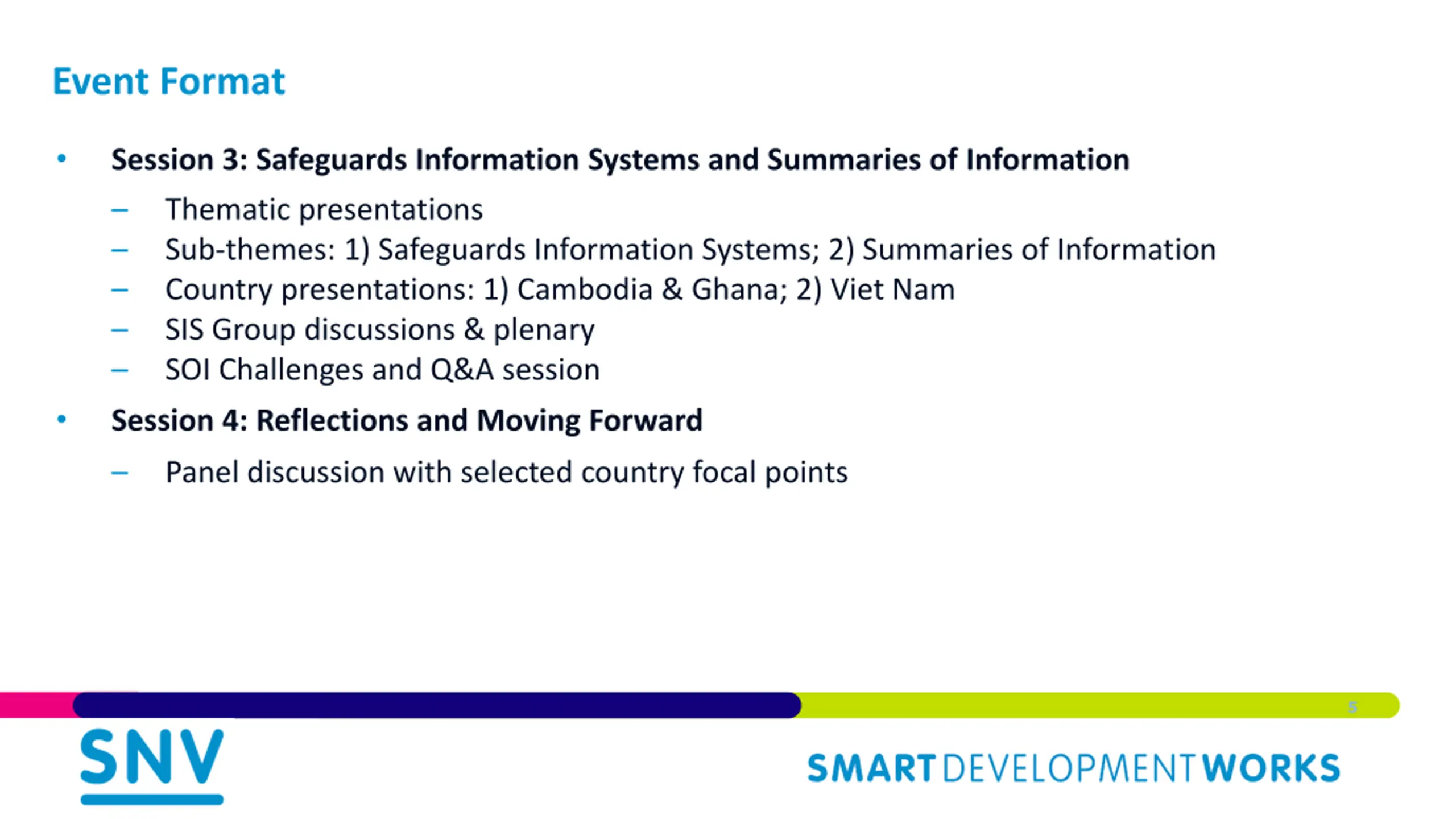 Event Format Session 3: Safeguards Information Systems and Summaries of Information Thematic presentations Sub-themes: 1) Safeguards Information Systems; 2) Summaries of Information Country presentations: 1) Cambodia & Ghana; 2) Viet Nam SIS Group discussions & plenary SOI Challenges and Q&A session Session 4: Reflections and Moving Forward Panel discussion with selected country focal points 5