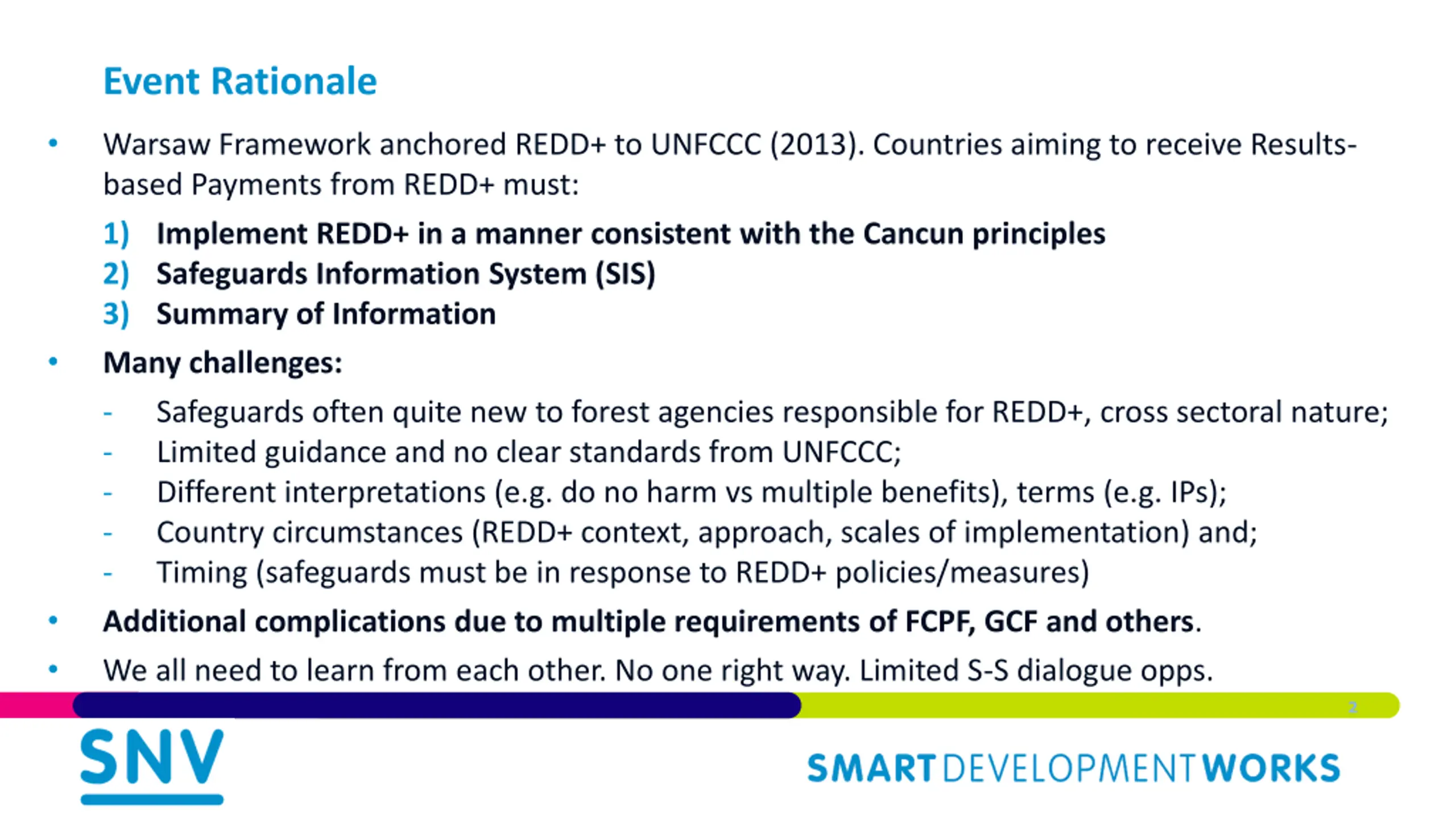 Event Rationale Warsaw Framework anchored REDD+ to UNFCCC (2013). Countries aiming to receive Results- based Payments from REDD+ must: 1) Implement REDD+ in a manner consistent with the Cancun principles 2) Safeguards Information System (SIS) 3) Summary of Information Many challenges: - Safeguards often quite new to forest agencies responsible for REDD+, cross sectoral nature; - Limited guidance and no clear standards from UNFCCC; - Different interpretations (e.g. do no harm vs multiple benefits), terms (e.g. IPs); - Country circumstances (REDD+ context, approach, scales of implementation) and; - Timing (safeguards must be in response to REDD+ policies/measures) Additional complications due to multiple requirements of FCPF, GCF and others. We all need to learn from each other. No one right way. Limited S-S dialogue opps. 2