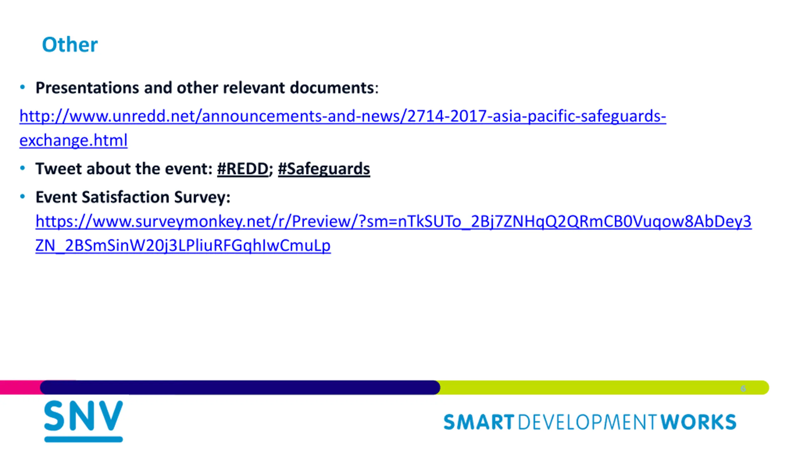 Other Presentations and other relevant documents: http://www.unredd.net/announcements-and-news/2714-2017-asia-pacific-safeguards- exchange.html Tweet about the event: #REDD; #Safeguards Event Satisfaction Survey: https://www.surveymonkey.net/r/Preview/?sm=nTkSUTo_2Bj7ZNHqQ2QRmCB0Vuqow8AbDey3 ZN_2BSmSinW20j3LPliuRFGqhIwCmuLp 6