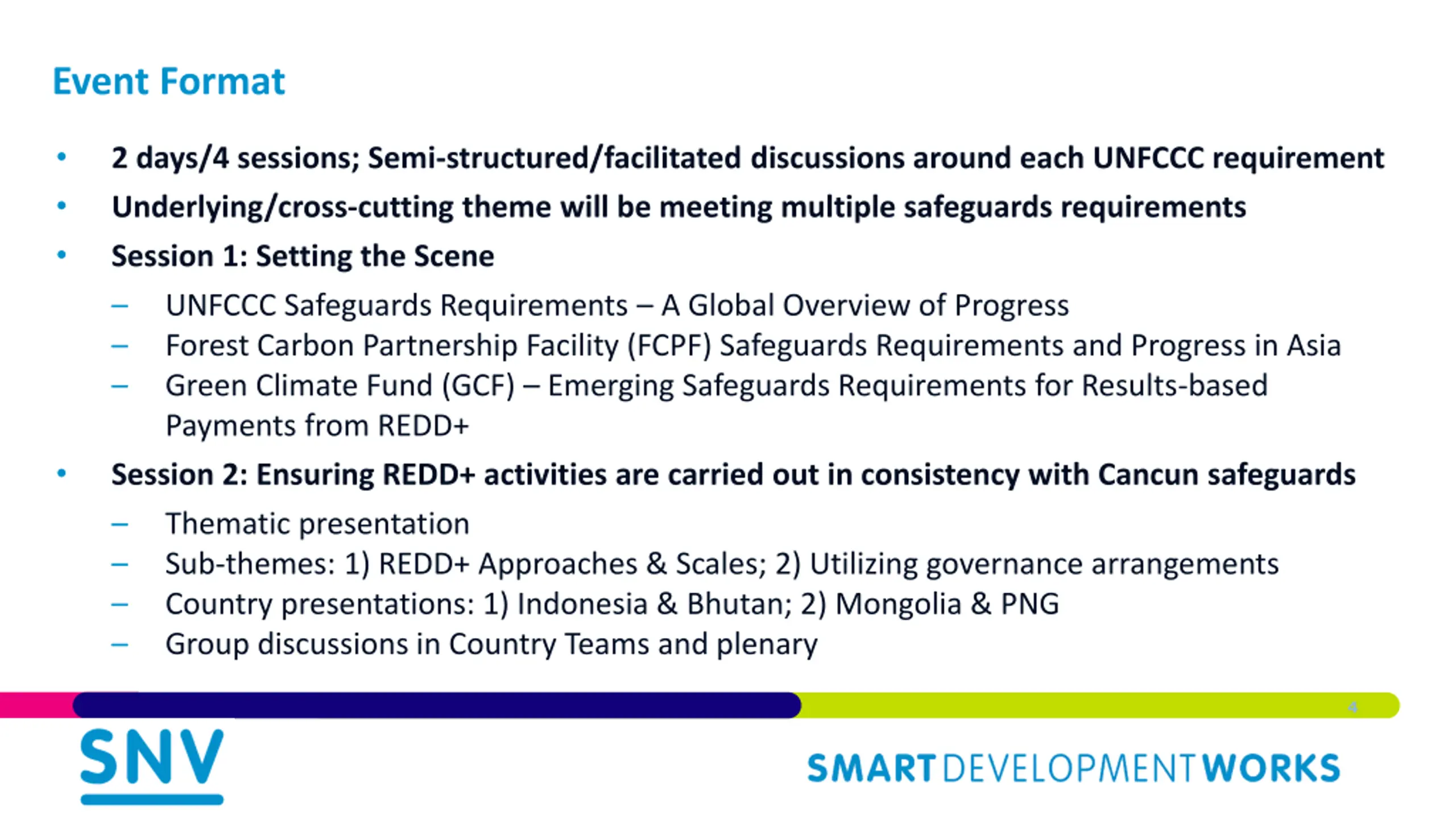 Event Format 2 days/4 sessions; Semi-structured/facilitated discussions around each UNFCCC requirement Underlying/cross-cutting theme will be meeting multiple safeguards requirements Session 1: Setting the Scene UNFCCC Safeguards Requirements A Global Overview of Progress Forest Carbon Partnership Facility (FCPF) Safeguards Requirements and Progress in Asia Green Climate Fund (GCF) Emerging Safeguards Requirements for Results-based Payments from REDD+ Session 2: Ensuring REDD+ activities are carried out in consistency with Cancun safeguards Thematic presentation Sub-themes: 1) REDD+ Approaches & Scales; 2) Utilizing governance arrangements Country presentations: 1) Indonesia & Bhutan; 2) Mongolia & PNG Group discussions in Country Teams and plenary 4
