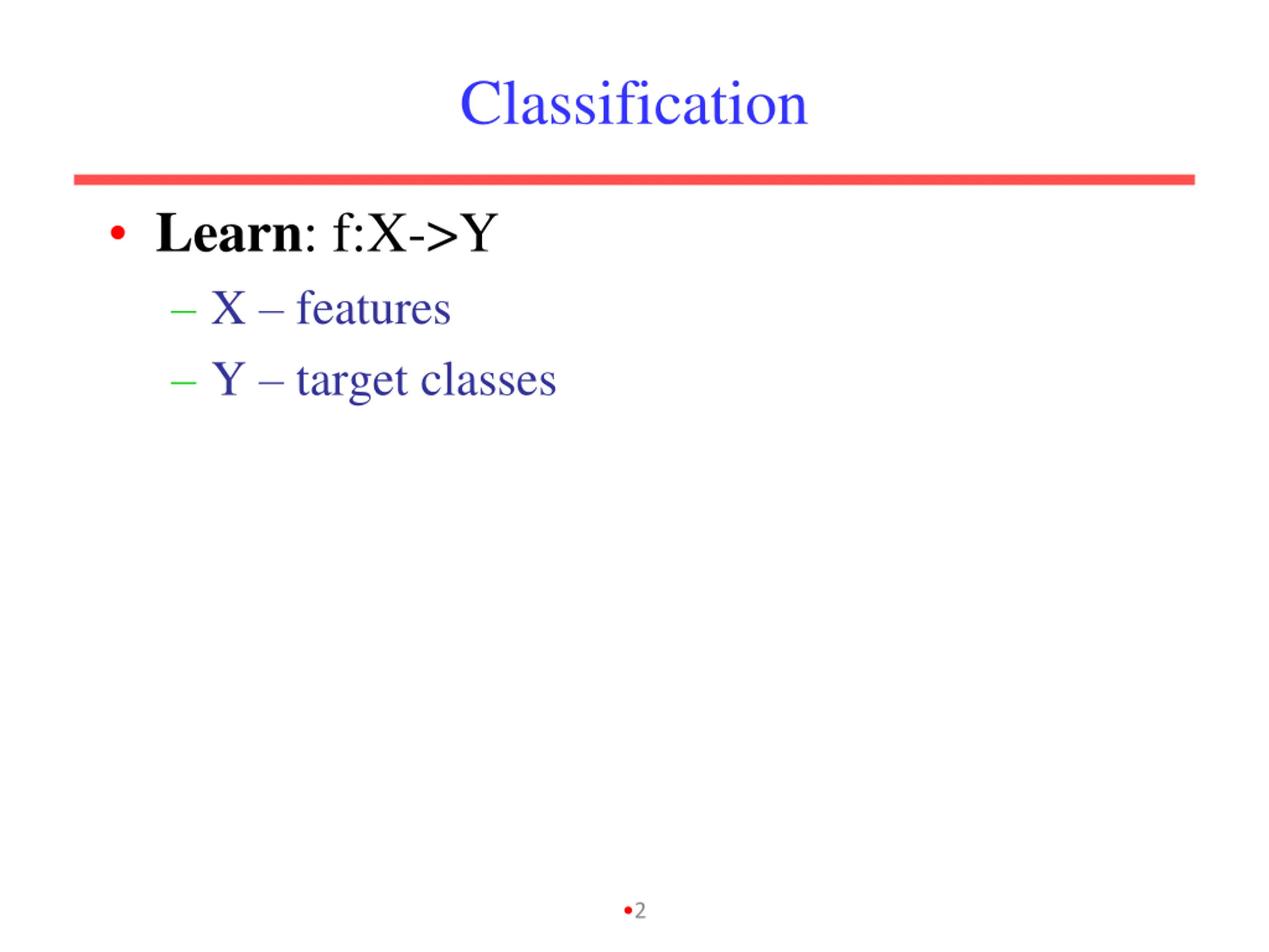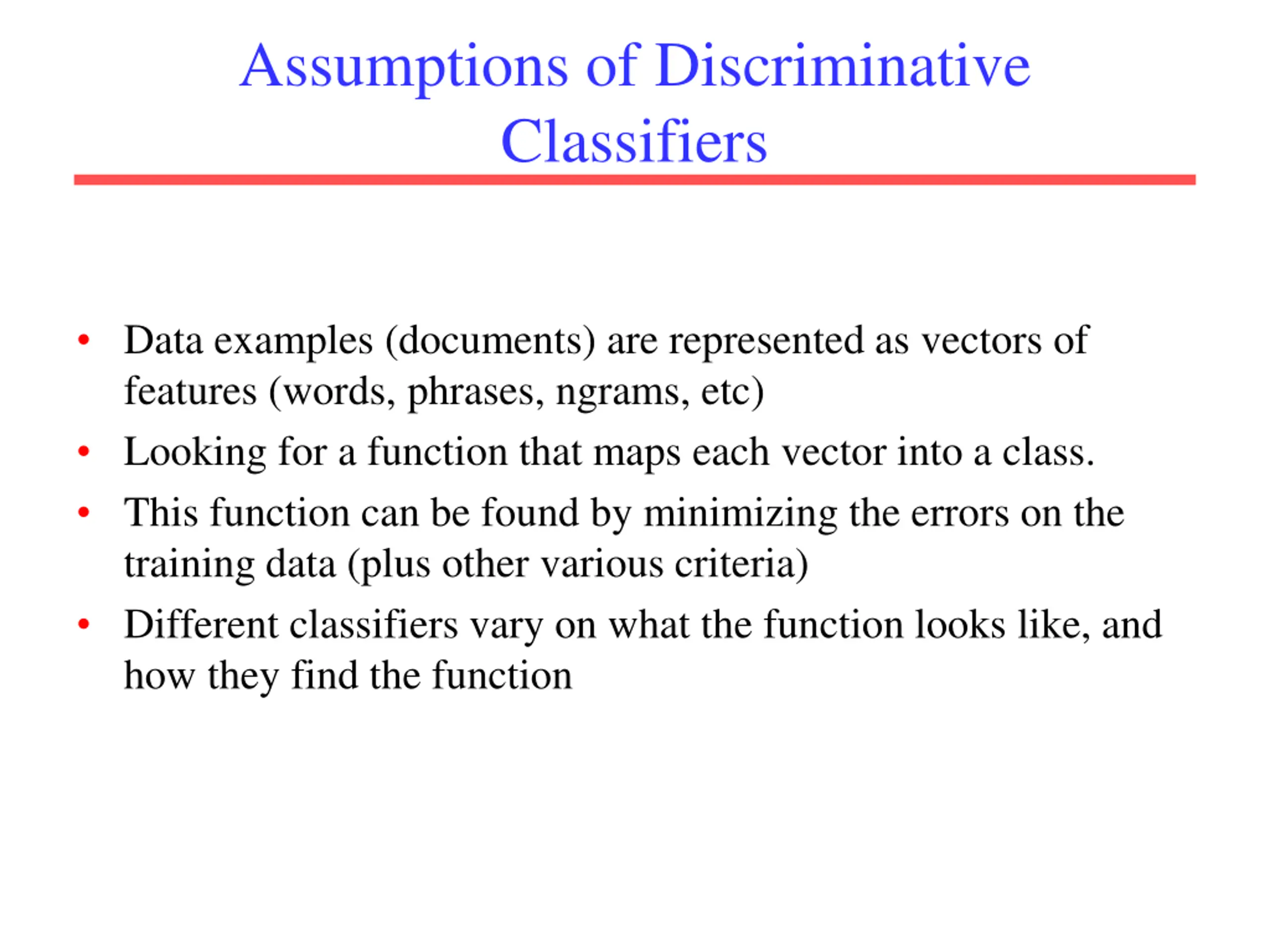 Assumptions of Discriminative Classifiers Data examples (documents) are represented as vectors of features (words, phrases, ngrams, etc) Looking for a function that maps each vector into a class. This function can be found by minimizing the errors on the training data (plus other various criteria) Different classifiers vary on what the function looks like, and how they find the function