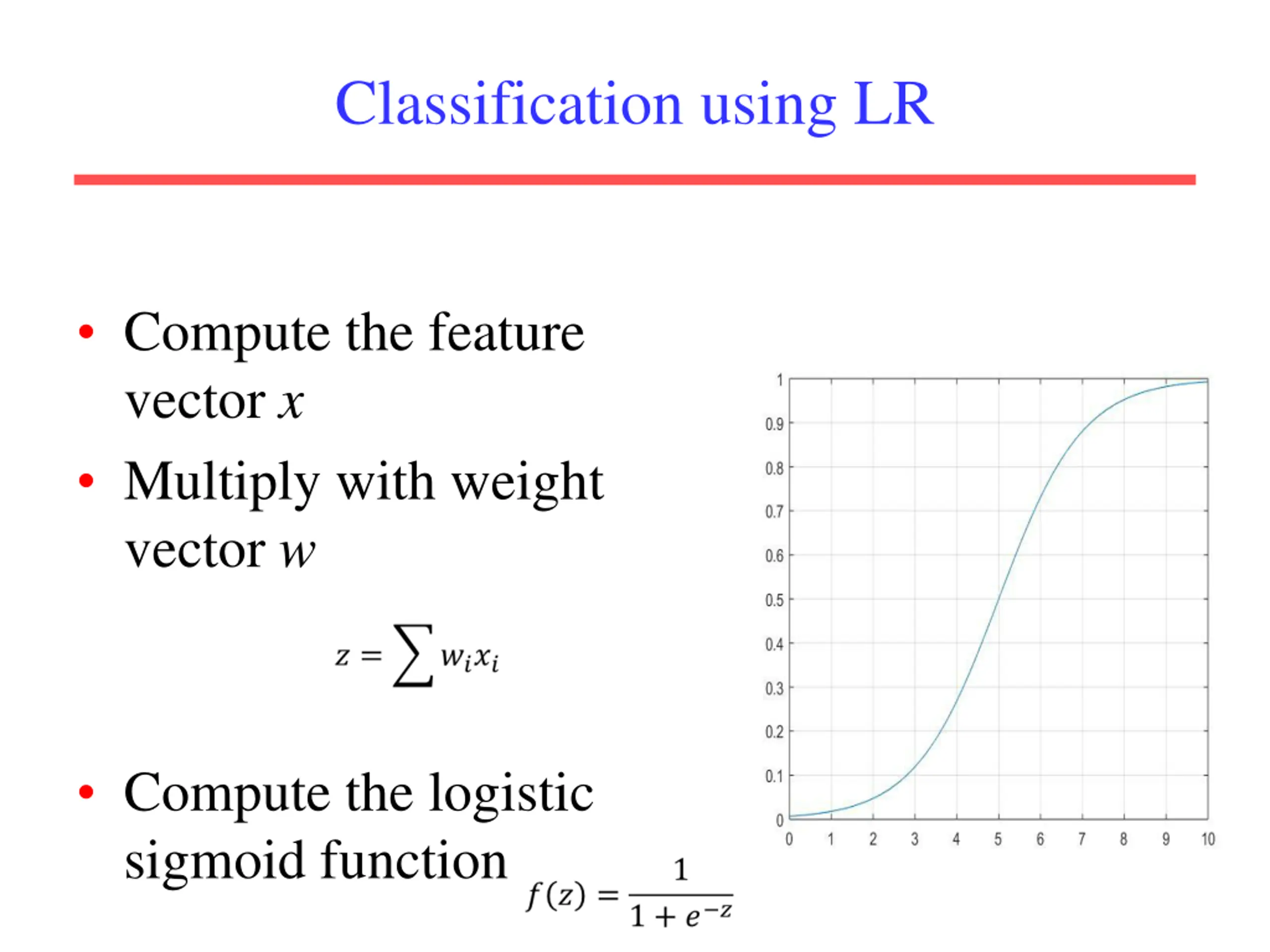 Classification using LR Compute the feature vector x Multiply with weight vector w Compute the logistic sigmoid function