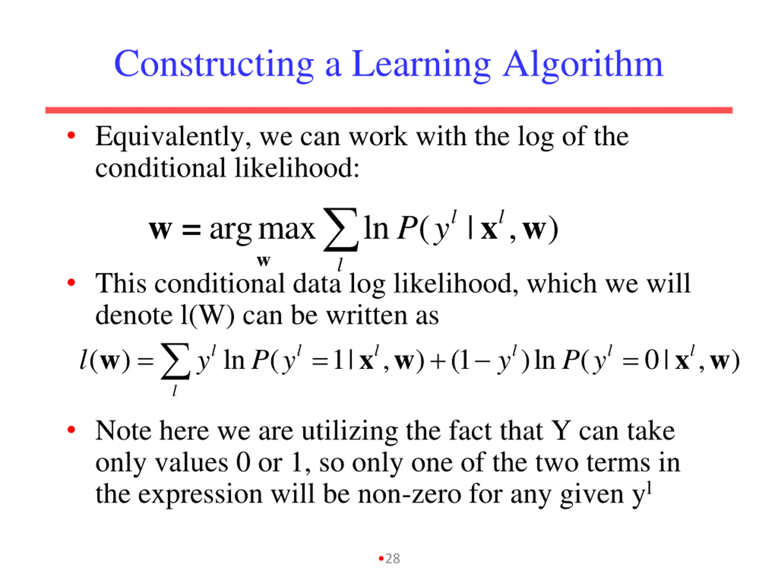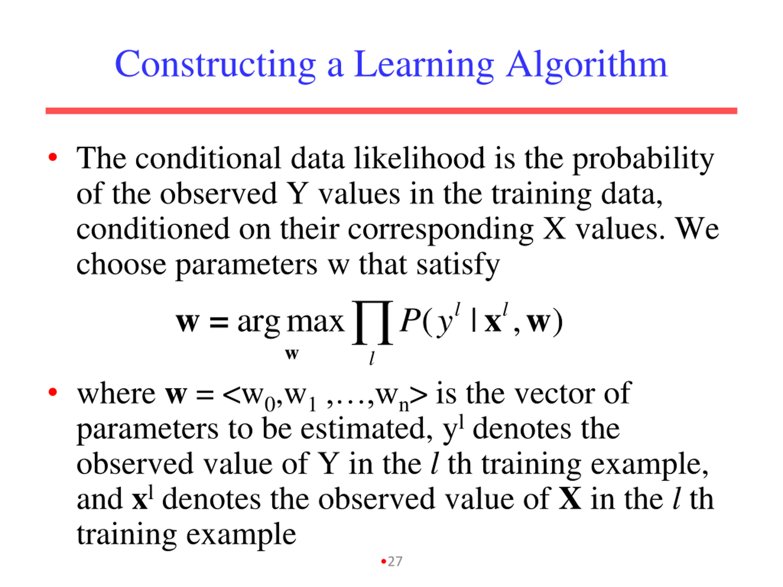 Constructing a Learning Algorithm The conditional data likelihood is the probability of the observed Y values in the training data, conditioned on their corresponding X values. We choose parameters w that satisfy w l l w = x w argmax ( | , ) P y l where w = <w0,w1, ,wn> is the vector of parameters to be estimated, yl denotes the observed value of Y in the l th training example, and xl denotes the observed value of X in the l th training example 27