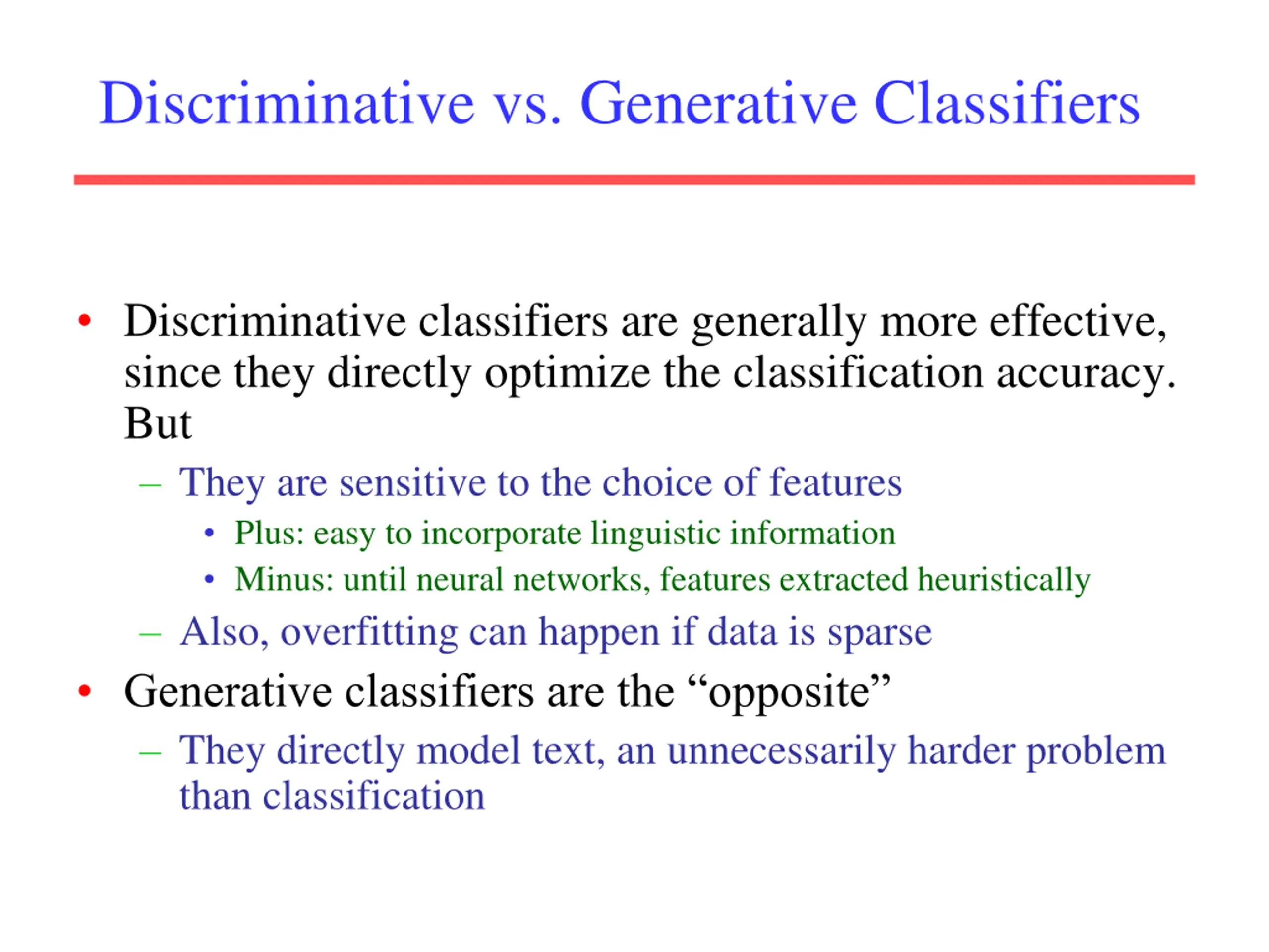 Discriminative vs. Generative Classifiers Discriminative classifiers are generally more effective, since they directly optimize the classification accuracy. But They are sensitive to the choice of features Plus: easy to incorporate linguistic information Minus: until neural networks, features extracted heuristically Also, overfitting can happen if data is sparse Generative classifiers are the opposite They directly model text, an unnecessarily harder problem than classification