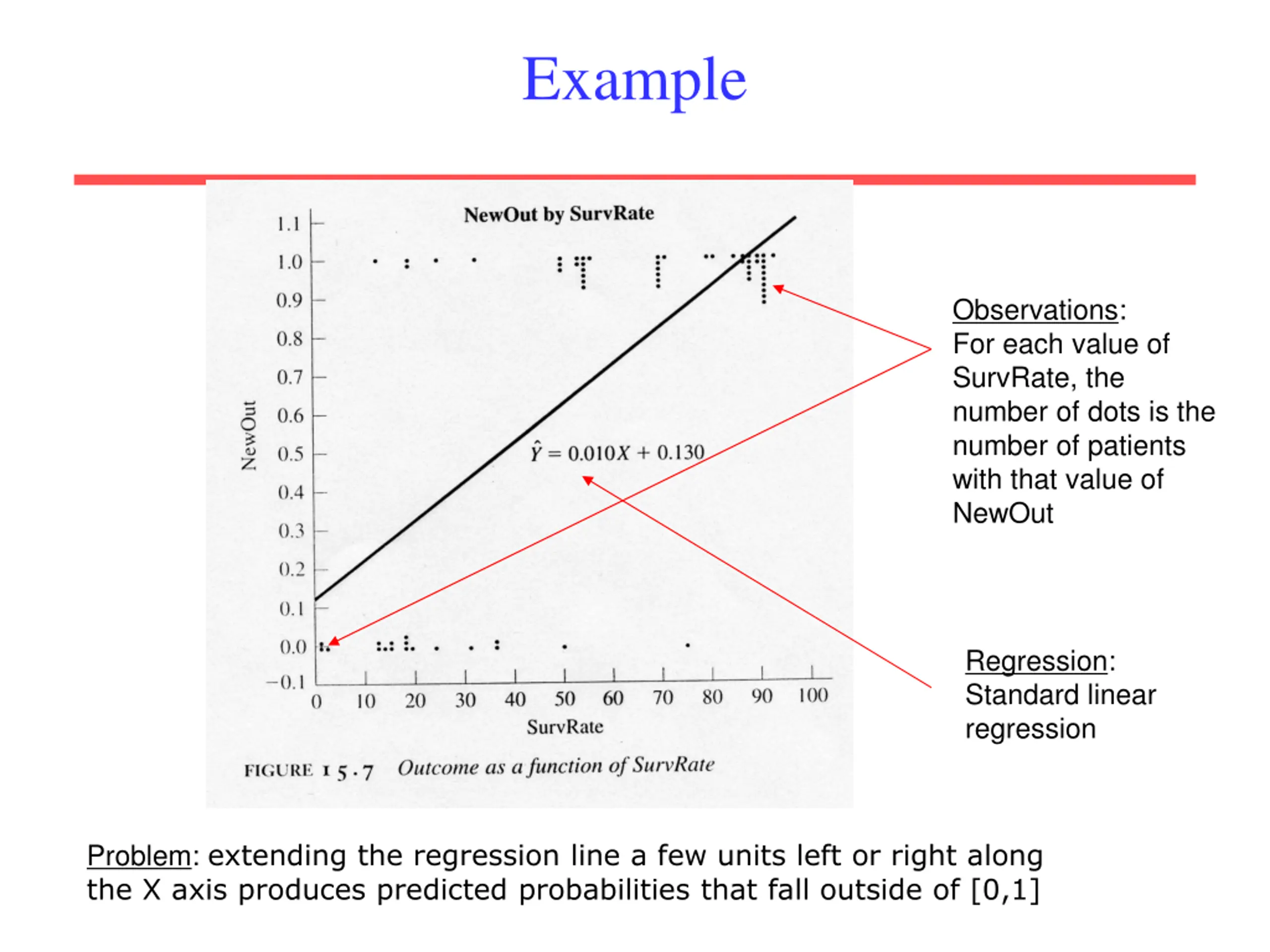 Example Observations: For each value of SurvRate, the number of dots is the number of patients with that value of NewOut Regression: Standard linear regression Problem: extending the regression line a few units left or right along the X axis produces predicted probabilities that fall outside of [0,1]