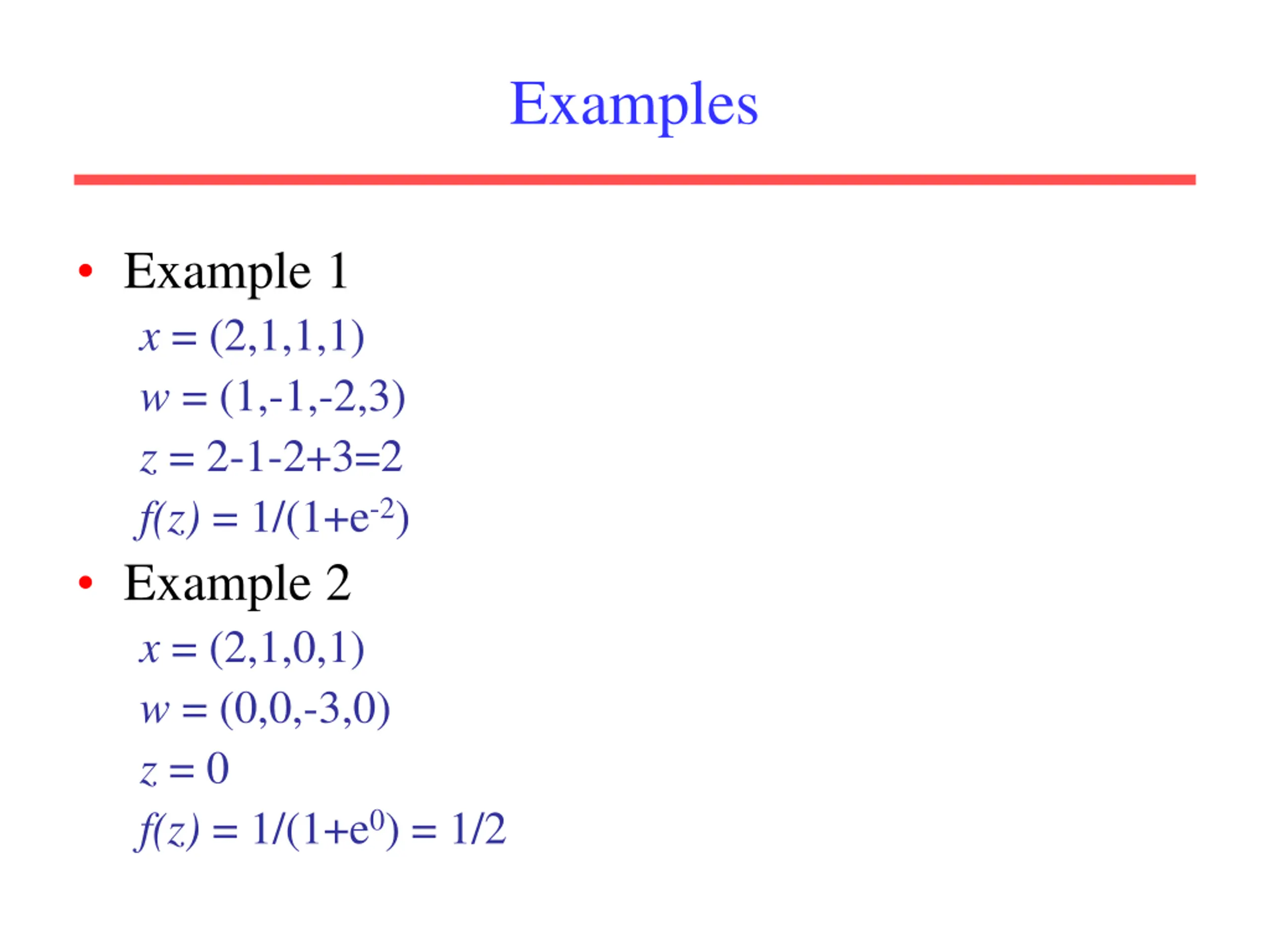 Examples Example 1 x = (2,1,1,1) w = (1,-1,-2,3) z = 2-1-2+3=2 f(z) = 1/(1+e-2) Example 2 x = (2,1,0,1) w = (0,0,-3,0) z = 0 f(z) = 1/(1+e0) = 1/2