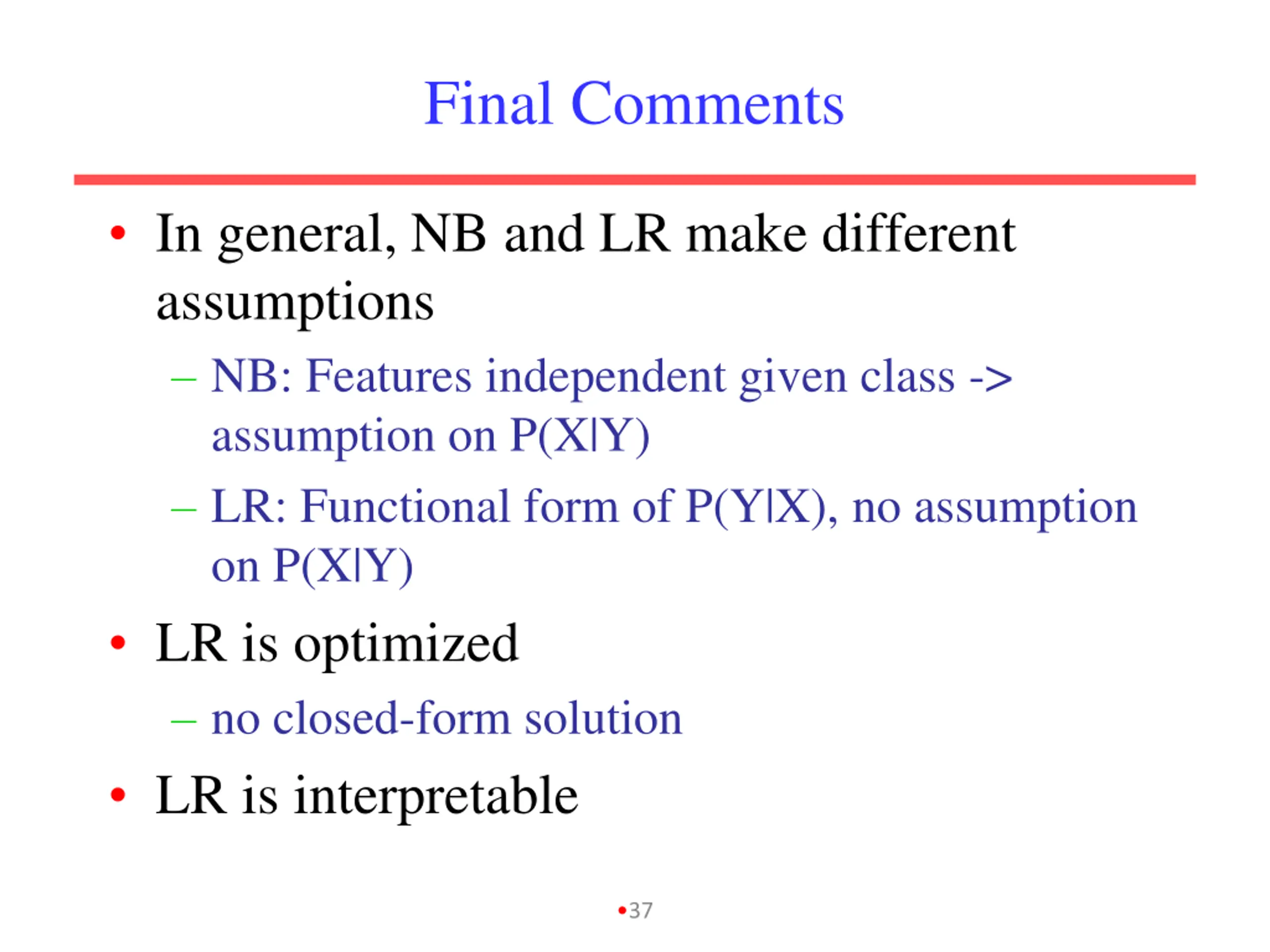 Final Comments In general, NB and LR make different assumptions NB: Features independent given class -> assumption on P(X|Y) LR: Functional form of P(Y|X), no assumption on P(X|Y) LR is optimized no closed-form solution LR is interpretable 37