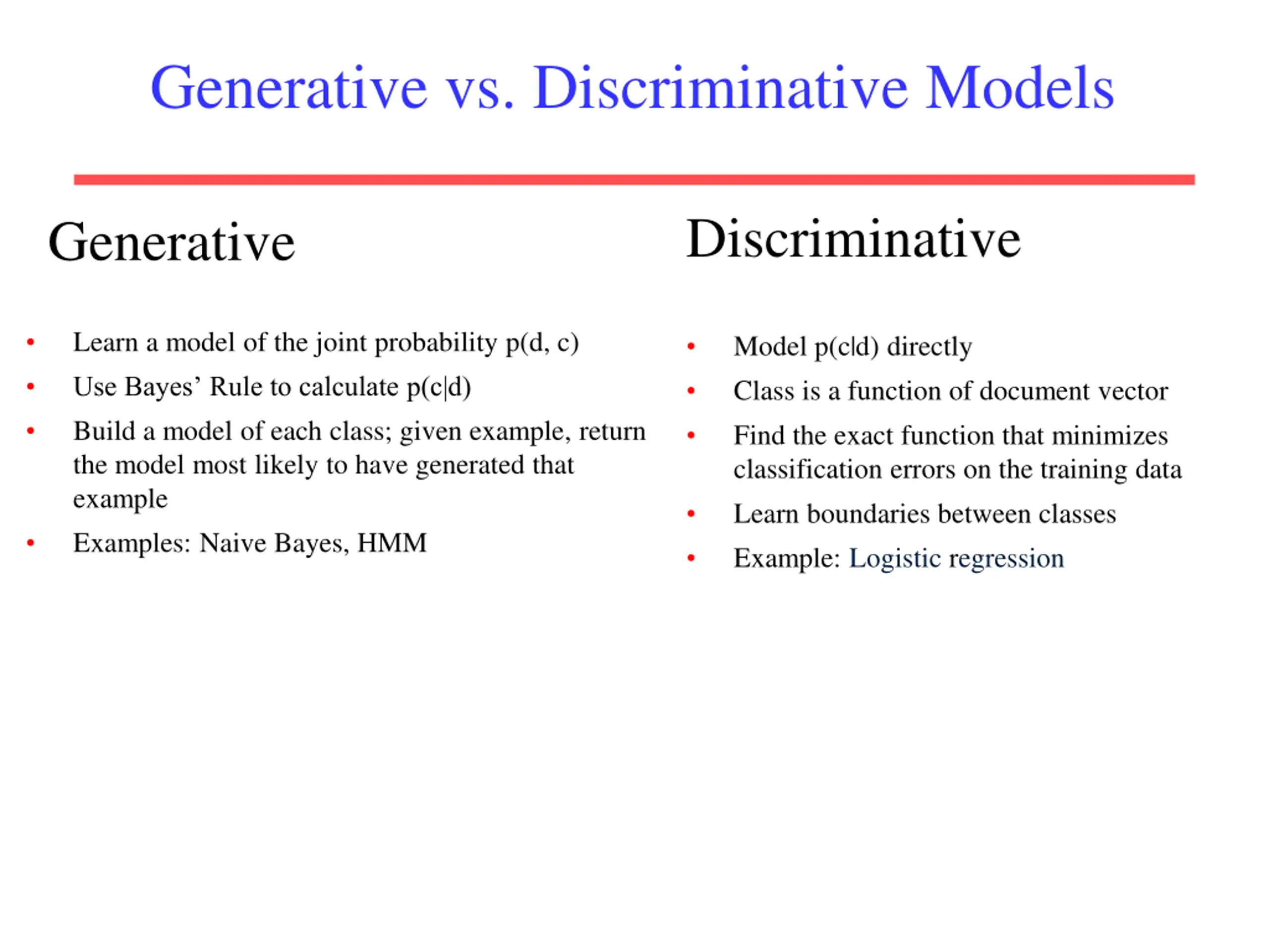 Generative vs. Discriminative Models Discriminative Generative Learn a model of the joint probability p(d, c) Use Bayes Rule to calculate p(c|d) Build a model of each class; given example, return the model most likely to have generated that example Examples: Naive Bayes, HMM Model p(c|d) directly Class is a function of document vector Find the exact function that minimizes classification errors on the training data Learn boundaries between classes Example: Logistic regression