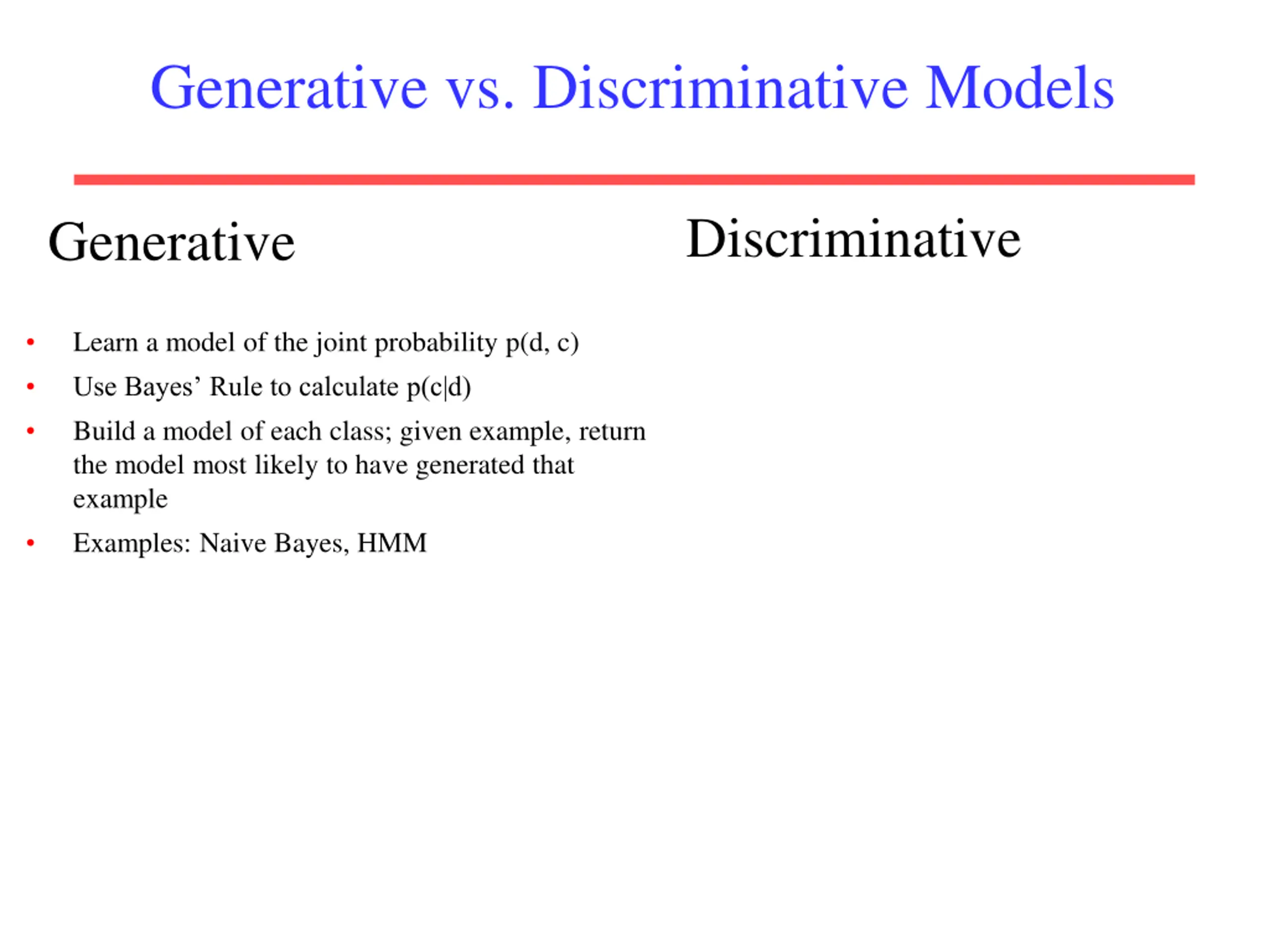 Generative vs. Discriminative Models Discriminative Generative Learn a model of the joint probability p(d, c) Use Bayes Rule to calculate p(c|d) Build a model of each class; given example, return the model most likely to have generated that example Examples: Naive Bayes, HMM