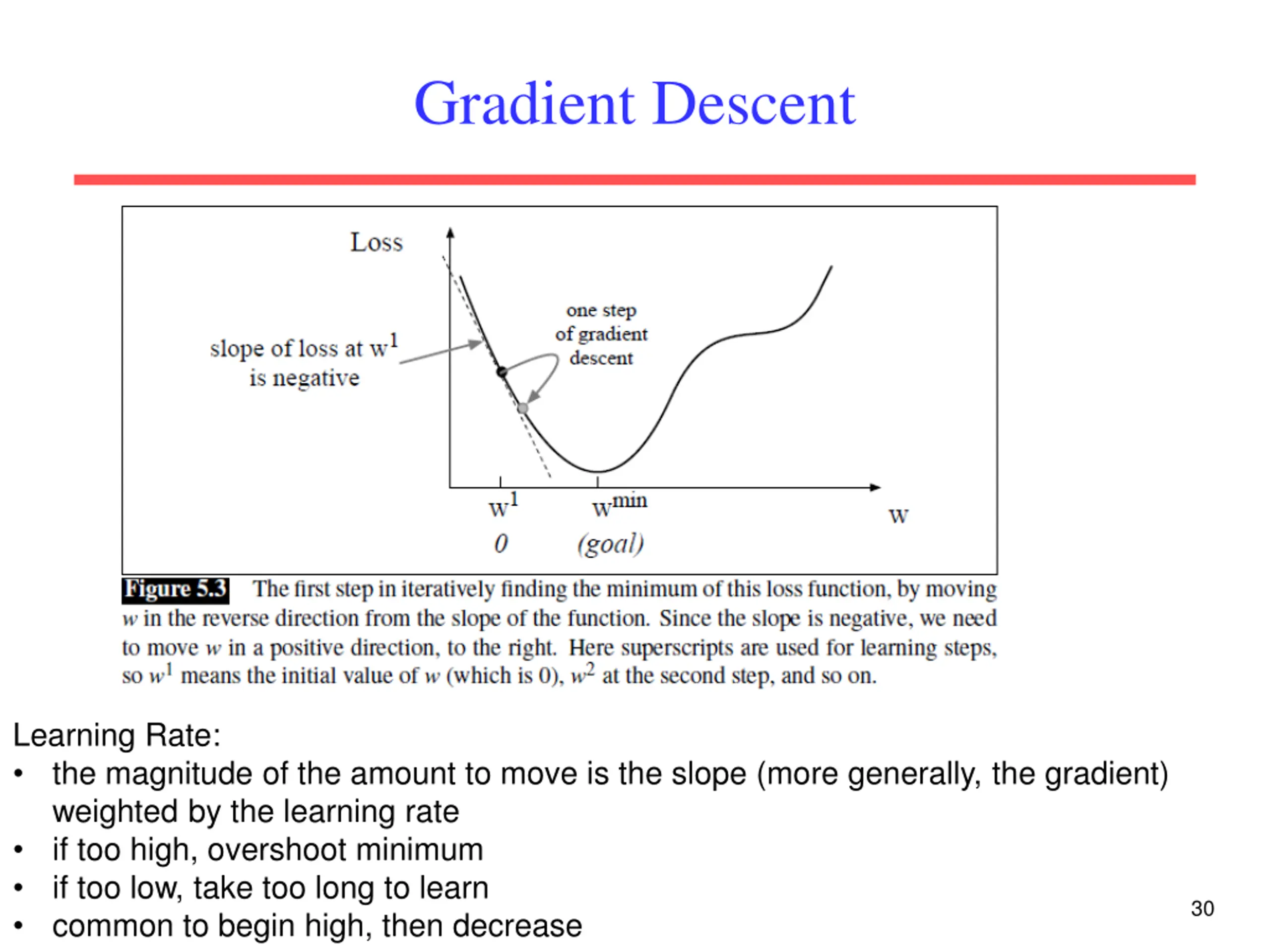 Gradient Descent Learning Rate: the magnitude of the amount to move is the slope (more generally, the gradient) weighted by the learning rate if too high, overshoot minimum if too low, take too long to learn common to begin high, then decrease 30