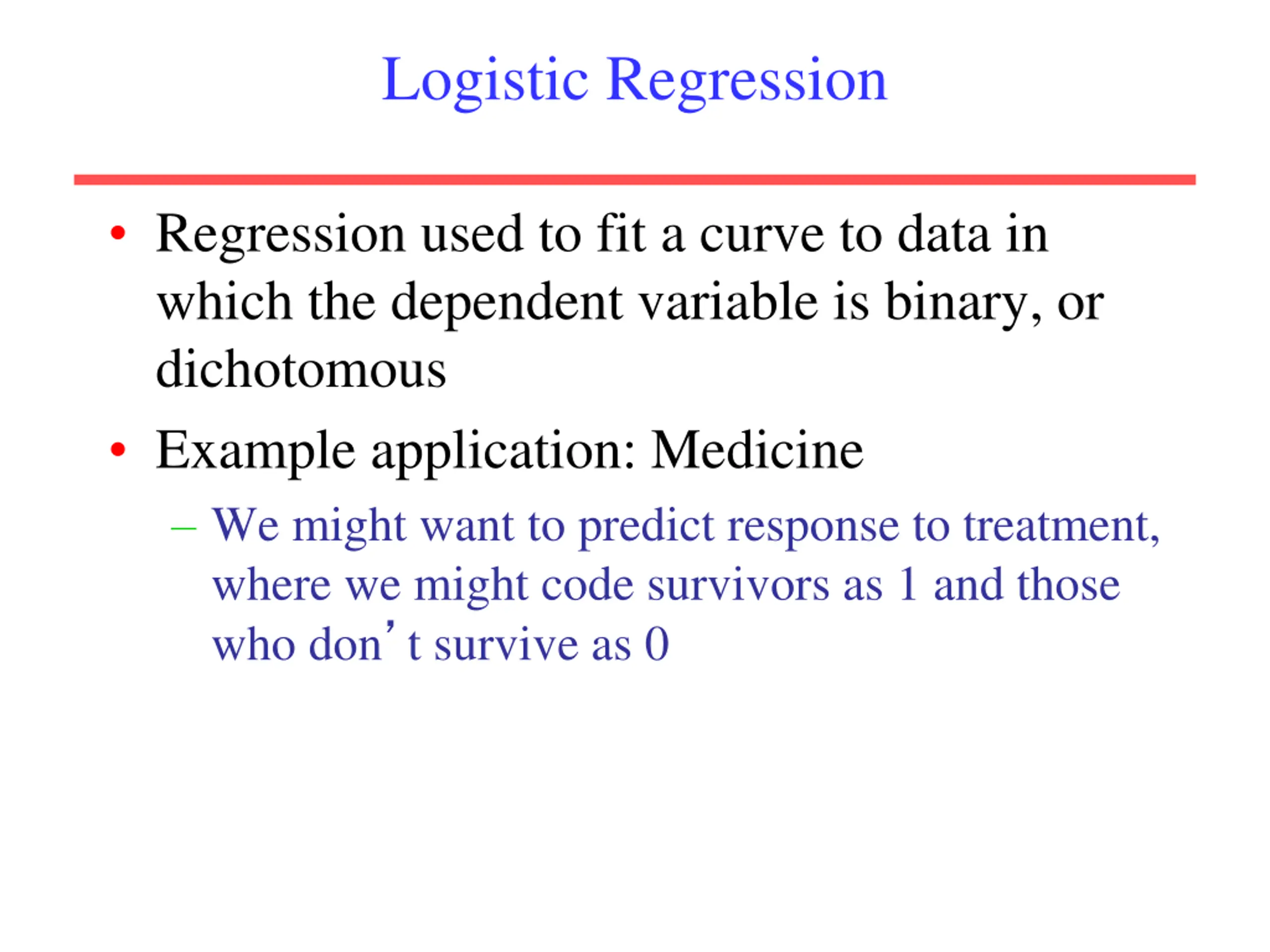 Logistic Regression Regression used to fit a curve to data in which the dependent variable is binary, or dichotomous Example application: Medicine We might want to predict response to treatment, where we might code survivors as 1 and those who don t survive as 0