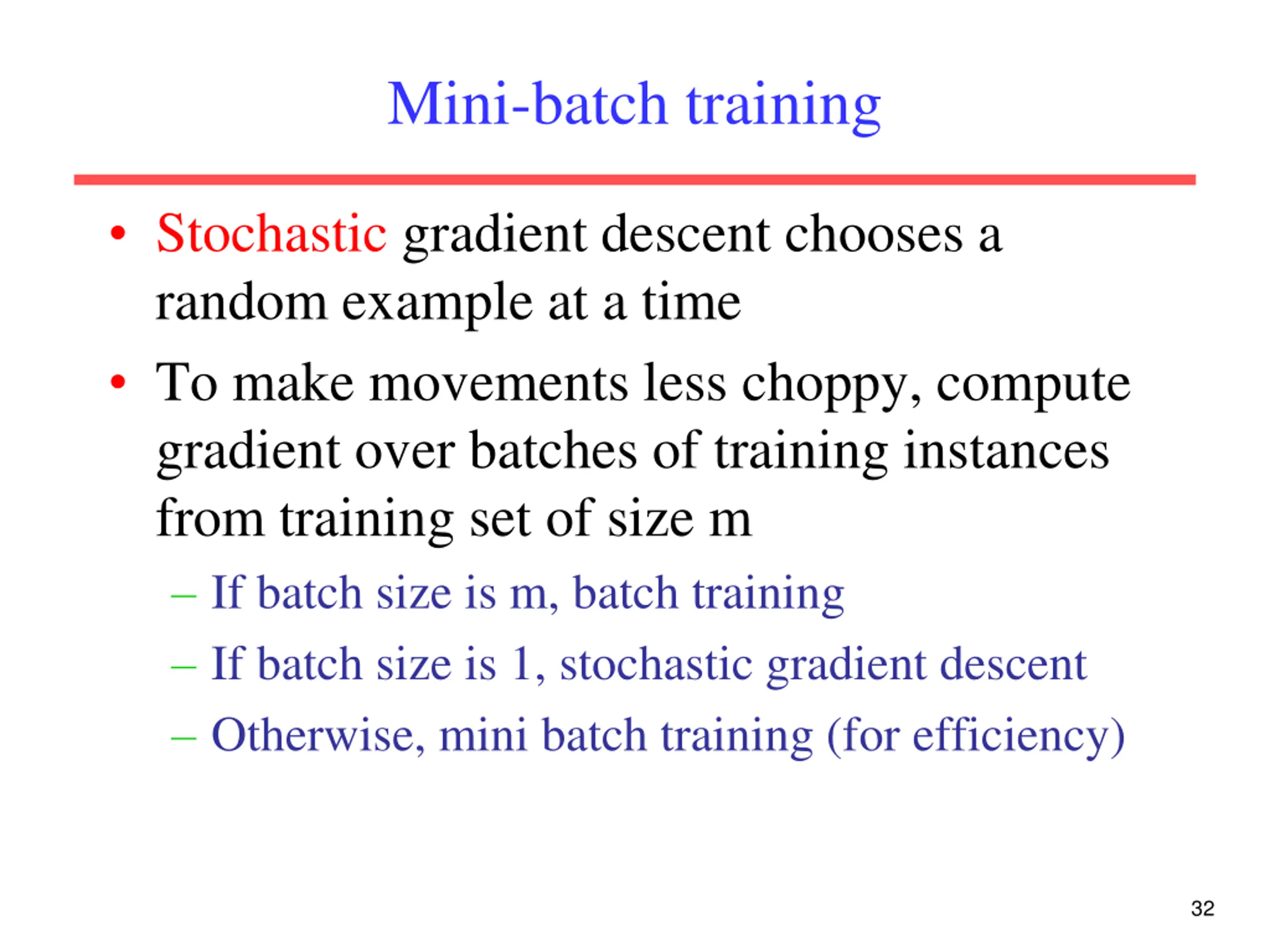 Mini-batch training Stochastic gradient descent chooses a random example at a time To make movements less choppy, compute gradient over batches of training instances from training set of size m If batch size is m, batch training If batch size is 1, stochastic gradient descent Otherwise, mini batch training (for efficiency) 32