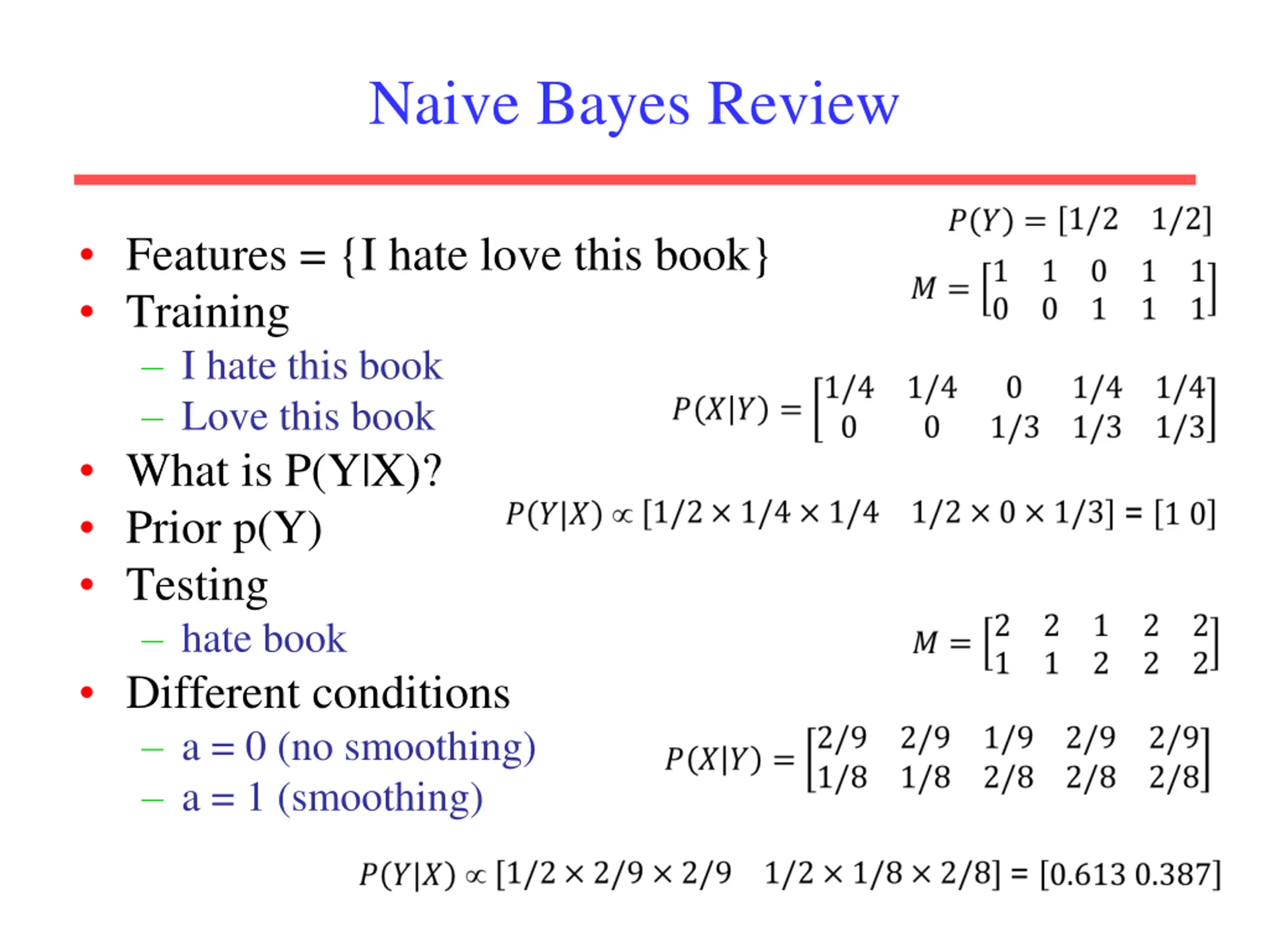 Naive Bayes Review Features = {I hate love this book} Training I hate this book Love this book What is P(Y|X)? Prior p(Y) Testing hate book Different conditions a = 0 (no smoothing) a = 1 (smoothing)