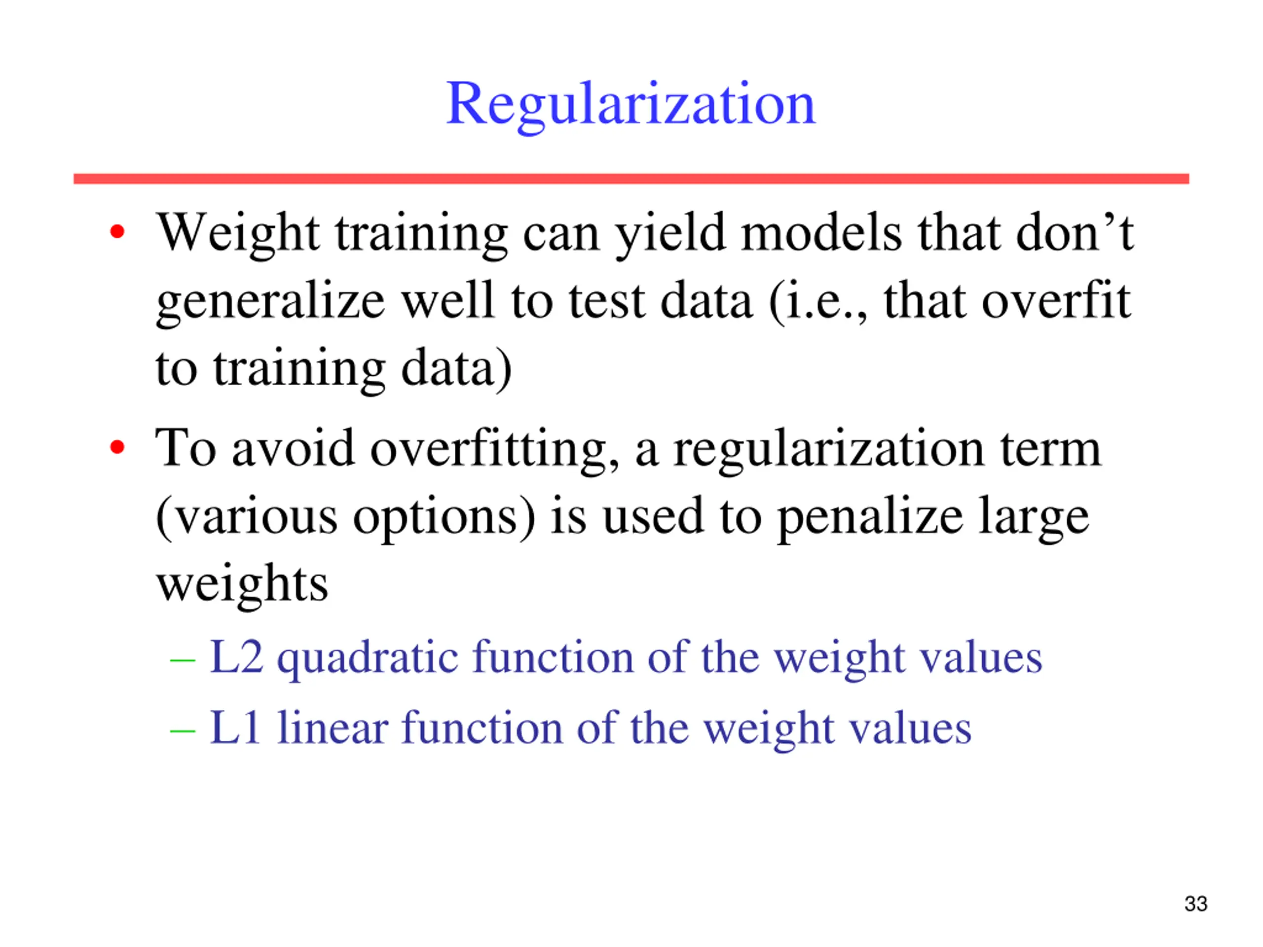 Regularization Weight training can yield models that don t generalize well to test data (i.e., that overfit to training data) To avoid overfitting, a regularization term (various options) is used to penalize large weights L2 quadratic function of the weight values L1 linear function of the weight values 33