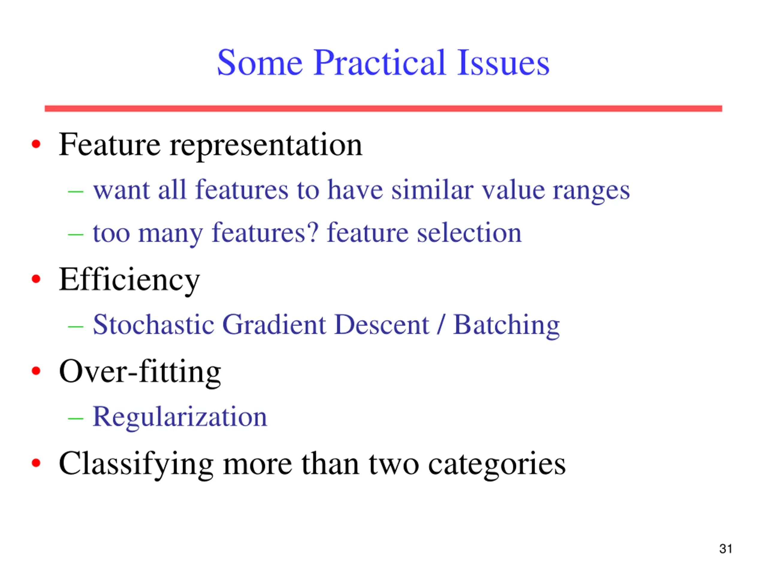 Some Practical Issues Feature representation want all features to have similar value ranges too many features? feature selection Efficiency Stochastic Gradient Descent / Batching Over-fitting Regularization Classifying more than two categories 31