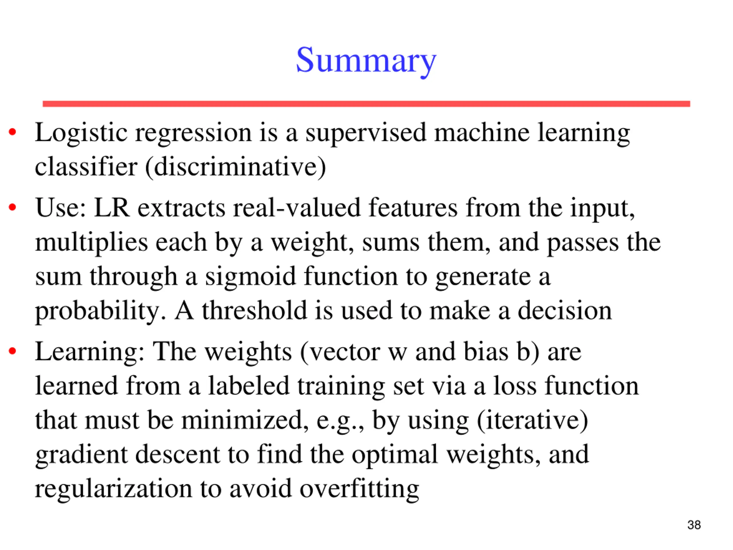 Summary Logistic regression is a supervised machine learning classifier (discriminative) Use: LR extracts real-valued features from the input, multiplies each by a weight, sums them, and passes the sum through a sigmoid function to generate a probability. A threshold is used to make a decision Learning: The weights (vector w and bias b) are learned from a labeled training set via a loss function that must be minimized, e.g., by using (iterative) gradient descent to find the optimal weights, and regularization to avoid overfitting 38