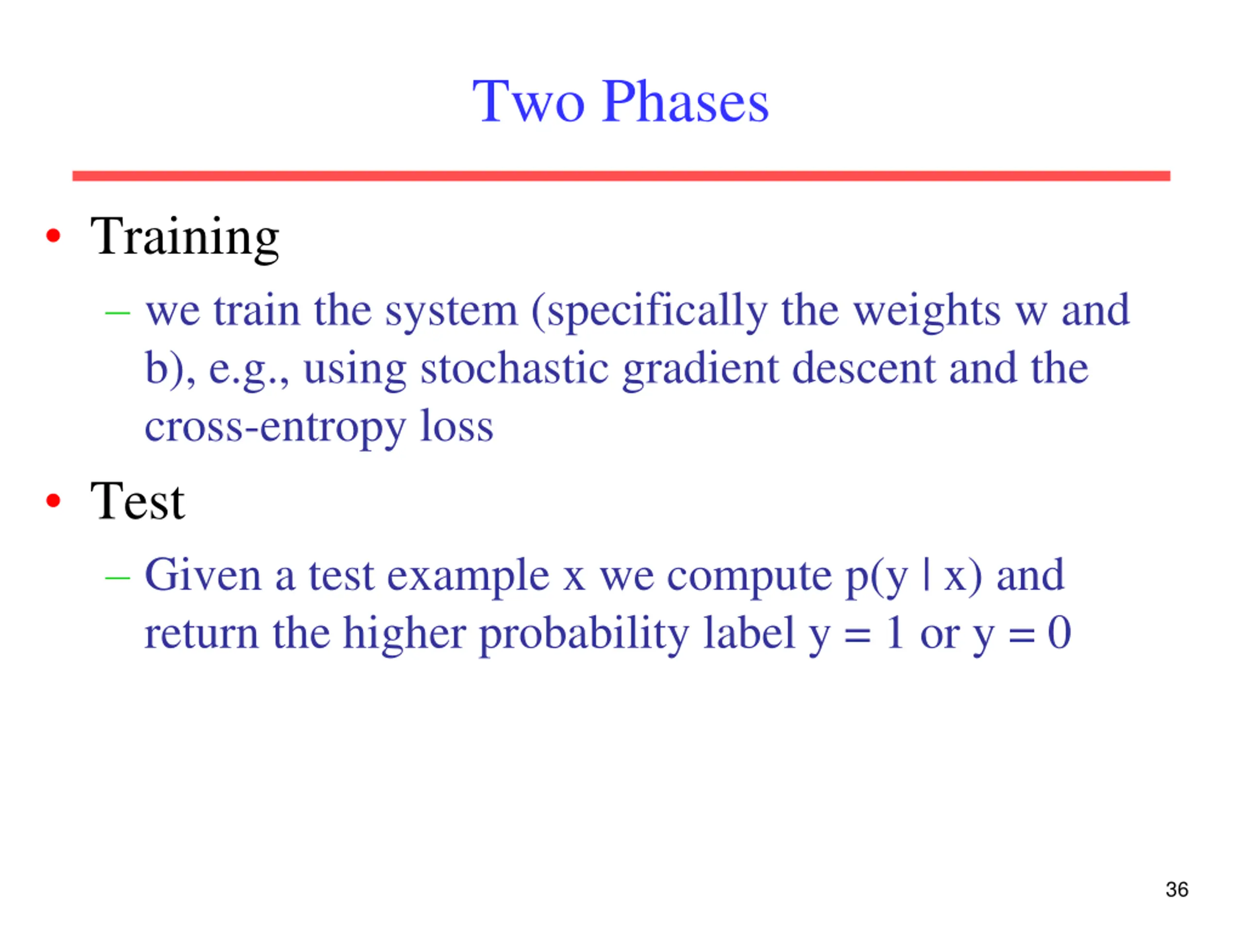 Two Phases Training we train the system (specifically the weights w and b), e.g., using stochastic gradient descent and the cross-entropy loss Test Given a test example x we compute p(y | x) and return the higher probability label y = 1 or y = 0 36
