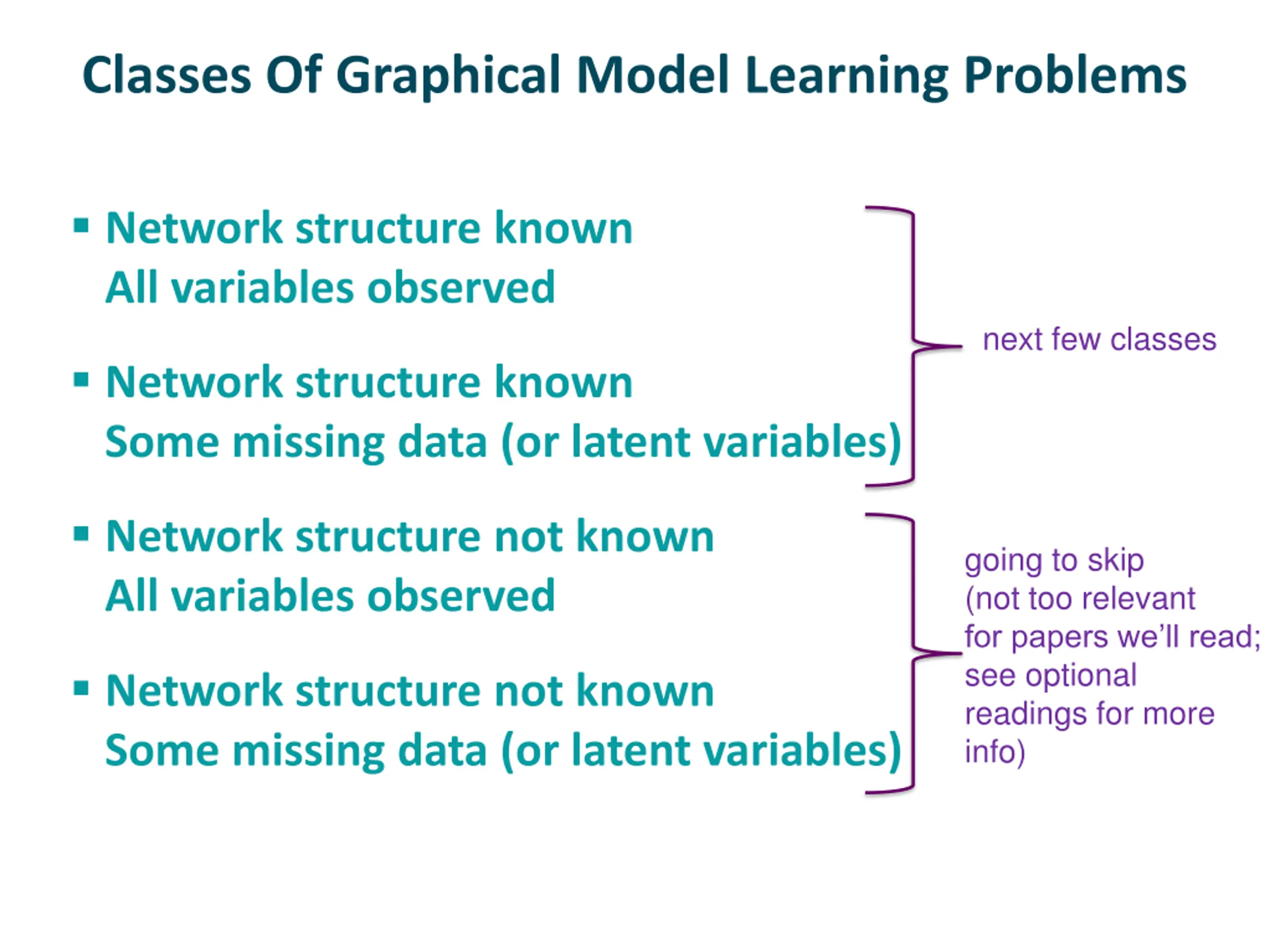 Classes Of Graphical Model Learning Problems Network structure known All variables observed next few classes Network structure known Some missing data (or latent variables) Network structure not known All variables observed going to skip (not too relevant for papers we ll read; see optional readings for more info) Network structure not known Some missing data (or latent variables)