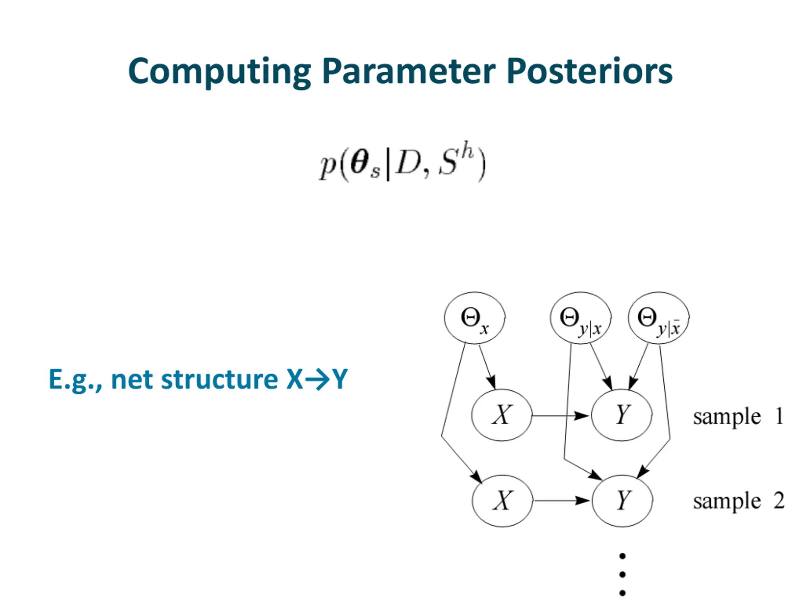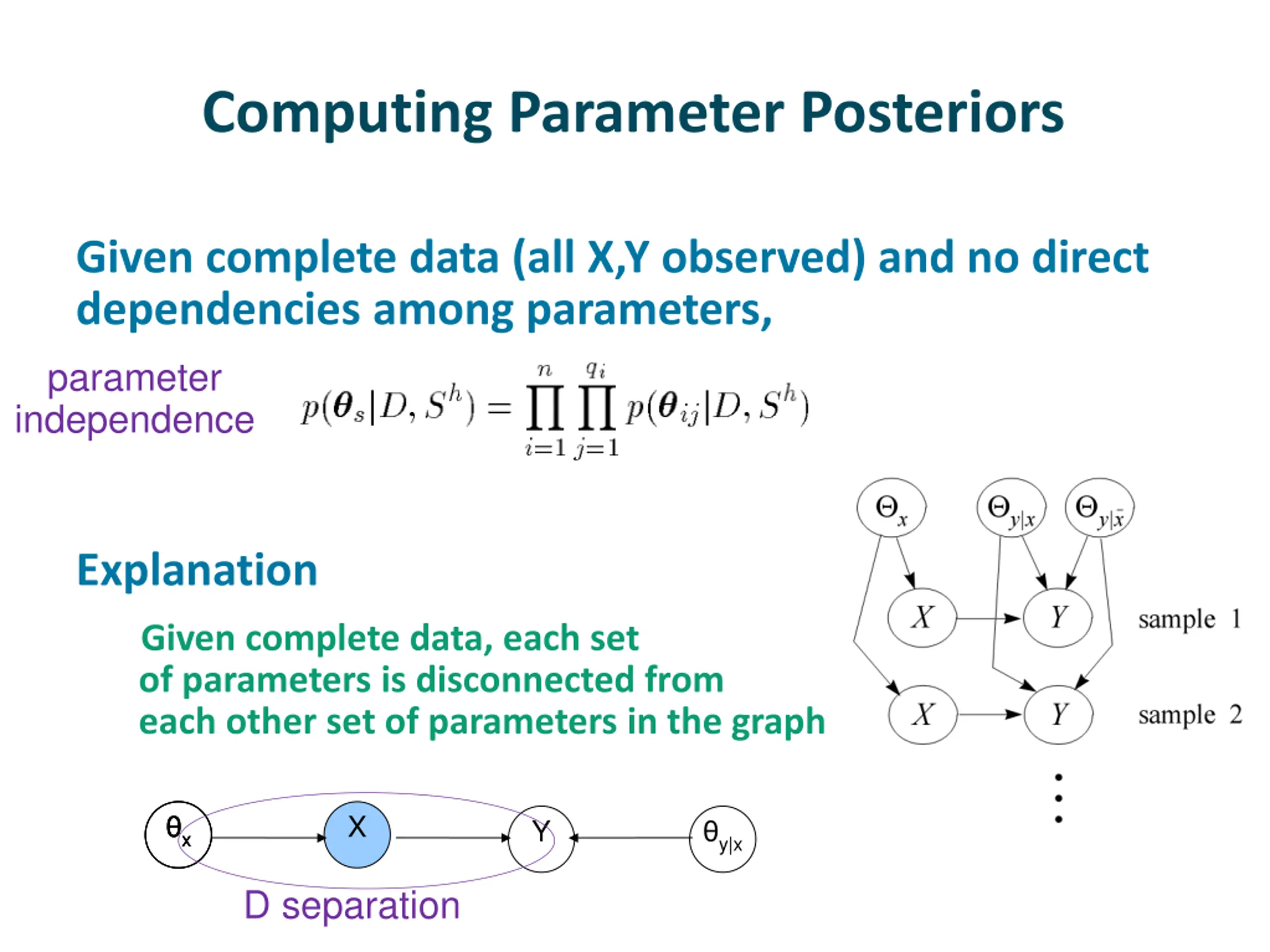Computing Parameter Posteriors Given complete data (all X,Y observed) and no direct dependencies among parameters, parameter independence Explanation Given complete data, each set of parameters is disconnected from each other set of parameters in the graph X x x x Y y|x D separation