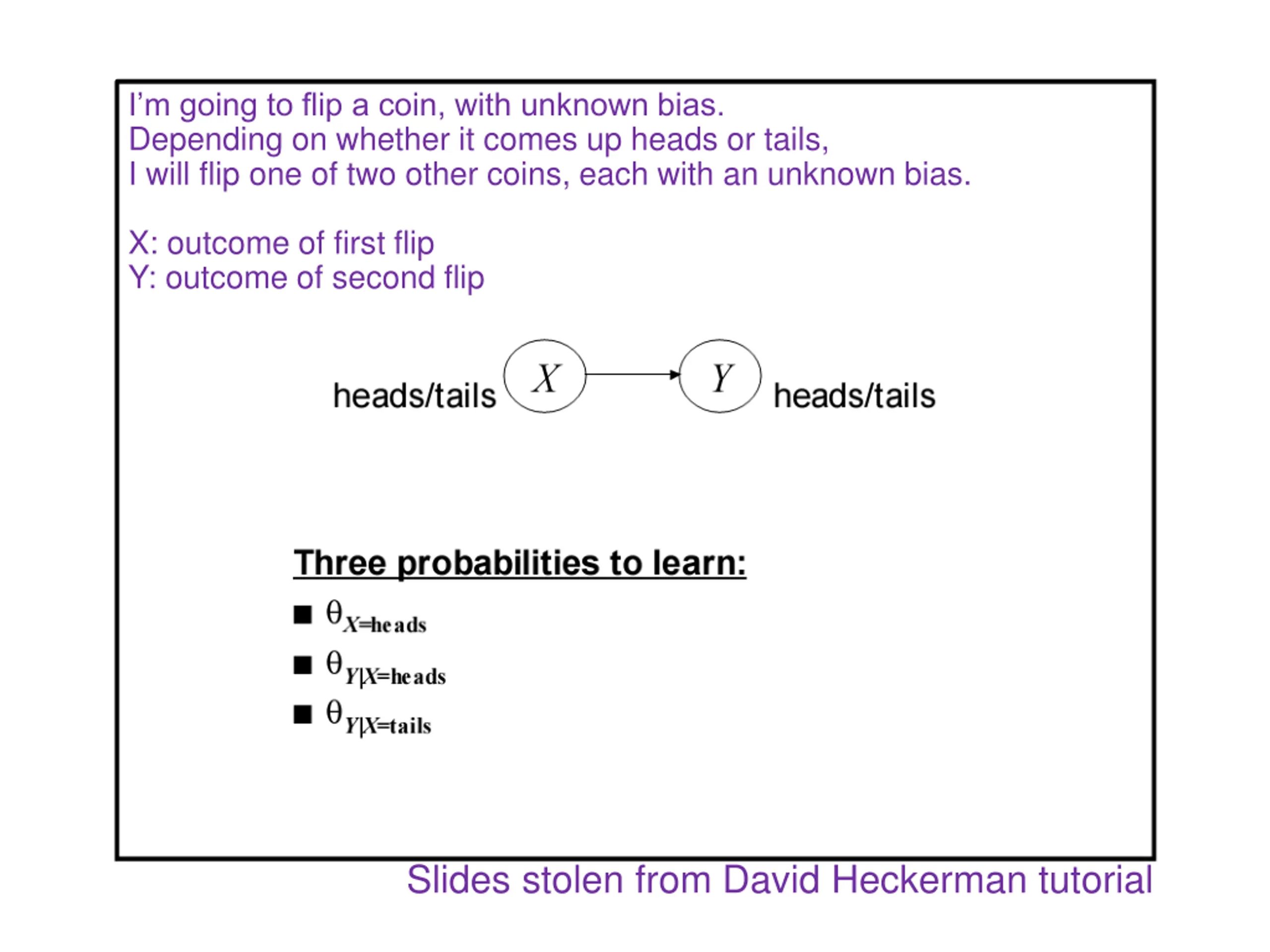 Im going to flip a coin, with unknown bias. Depending on whether it comes up heads or tails, I will flip one of two other coins, each with an unknown bias. X: outcome of first flip Y: outcome of second flip Slides stolen from David Heckerman tutorial