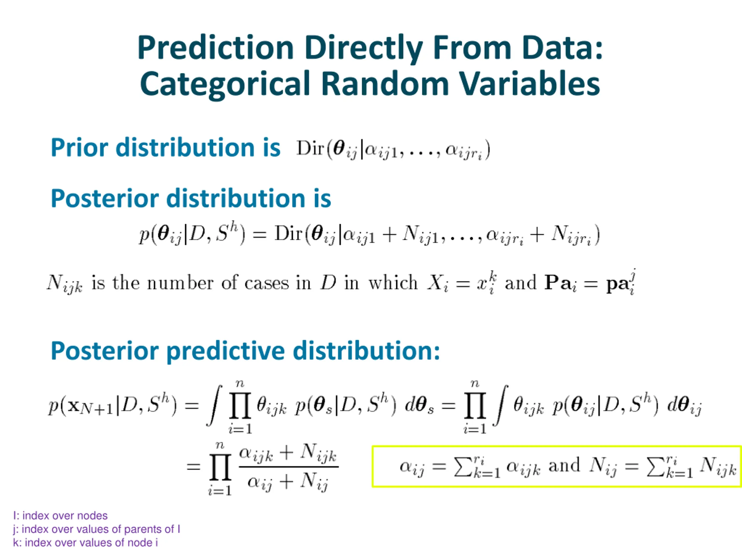 Prediction Directly From Data: Categorical Random Variables Prior distribution is Posterior distribution is Posterior predictive distribution: I: index over nodes j: index over values of parents of I k: index over values of node i