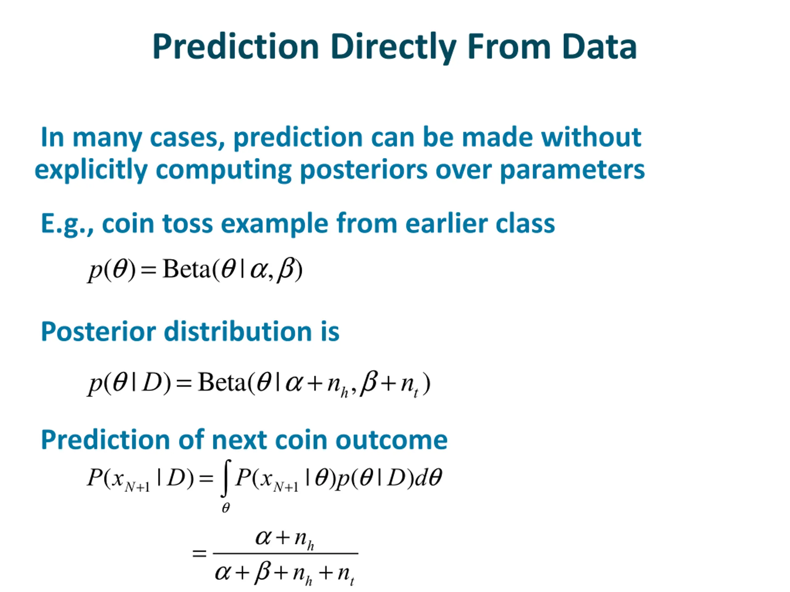 Prediction Directly From Data In many cases, prediction can be made without explicitly computing posteriors over parameters E.g., coin toss example from earlier class p(q)= Beta(q |a,b) Posterior distribution is p(q | D)= Beta(q |a +nh,b +nt) Prediction of next coin outcome P(xN+1| D)= P(xN+1|q) q p(q | D)dq a +nh = a +b +nh+nt