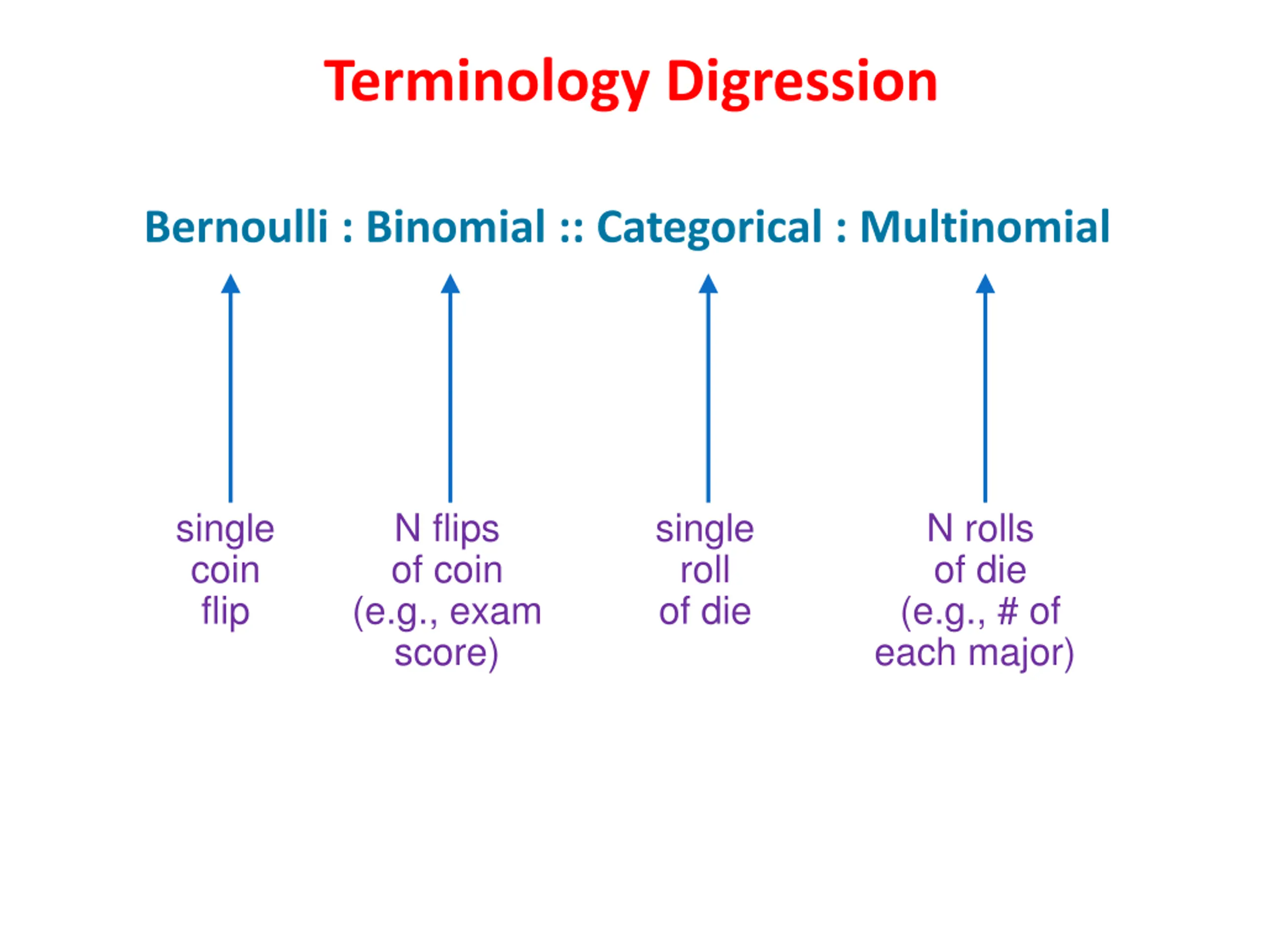 Terminology Digression Bernoulli : Binomial :: Categorical : Multinomial single coin flip N flips of coin (e.g., exam score) single roll of die N rolls of die (e.g., # of each major)