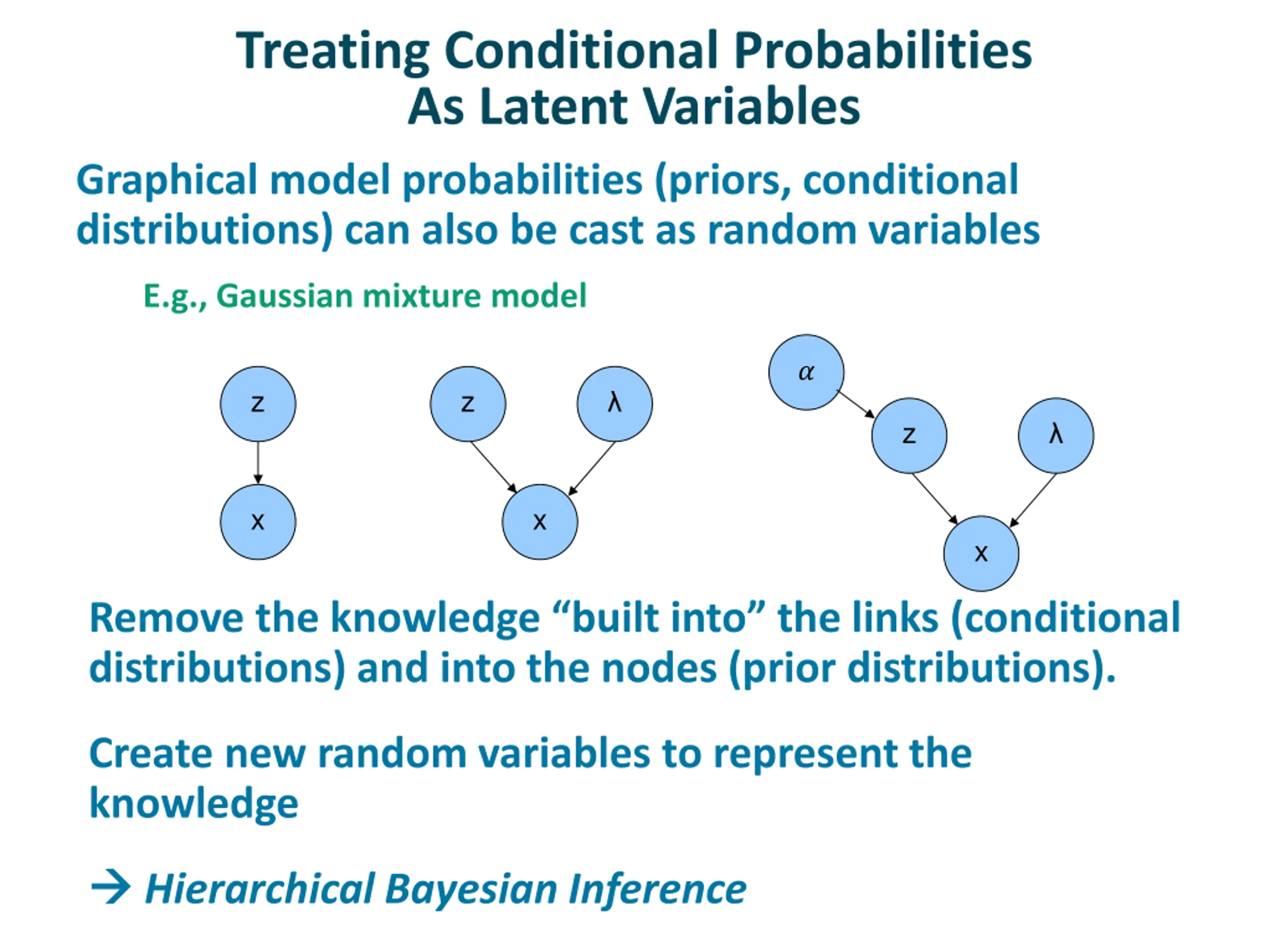 Treating Conditional Probabilities As Latent Variables Graphical model probabilities (priors, conditional distributions) can also be cast as random variables E.g., Gaussian mixture model ? z z z x x x Remove the knowledge built into the links (conditional distributions) and into the nodes (prior distributions). Create new random variables to represent the knowledge Hierarchical Bayesian Inference