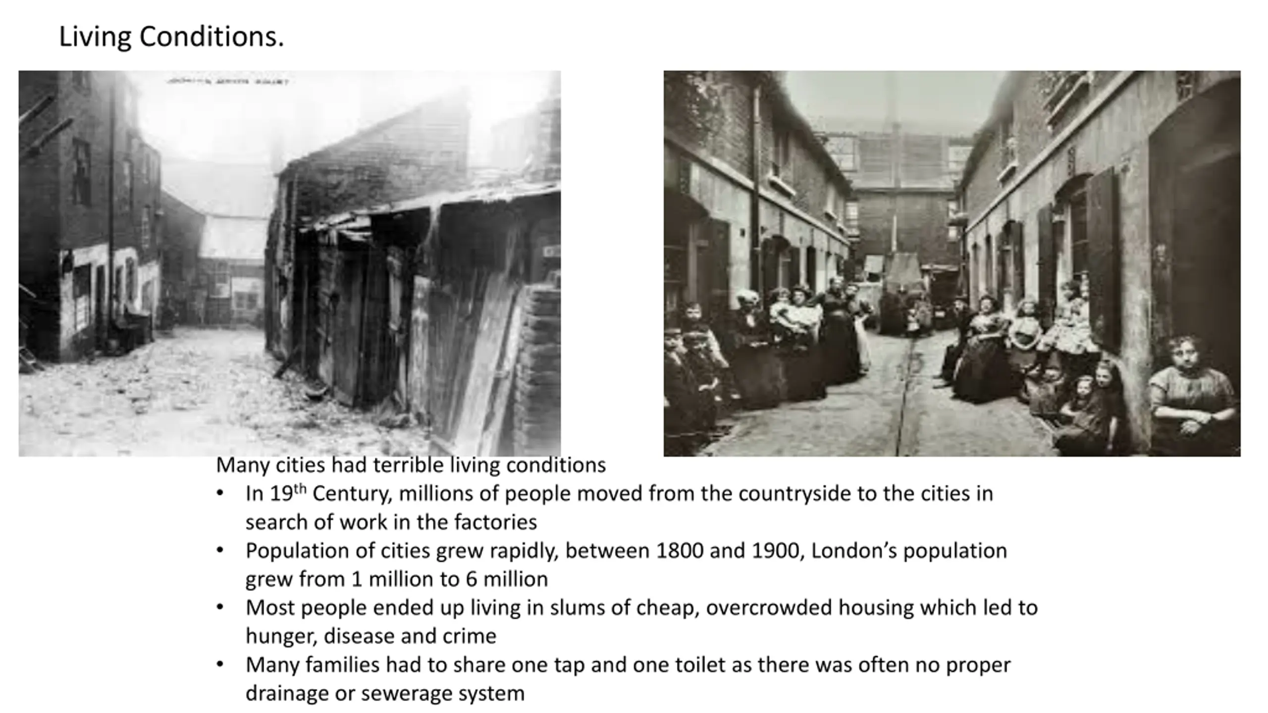 Living Conditions. Many cities had terrible living conditions In 19th Century, millions of people moved from the countryside to the cities in search of work in the factories Population of cities grew rapidly, between 1800 and 1900, London s population grew from 1 million to 6 million Most people ended up living in slums of cheap, overcrowded housing which led to hunger, disease and crime Many families had to share one tap and one toilet as there was often no proper drainage or sewerage system