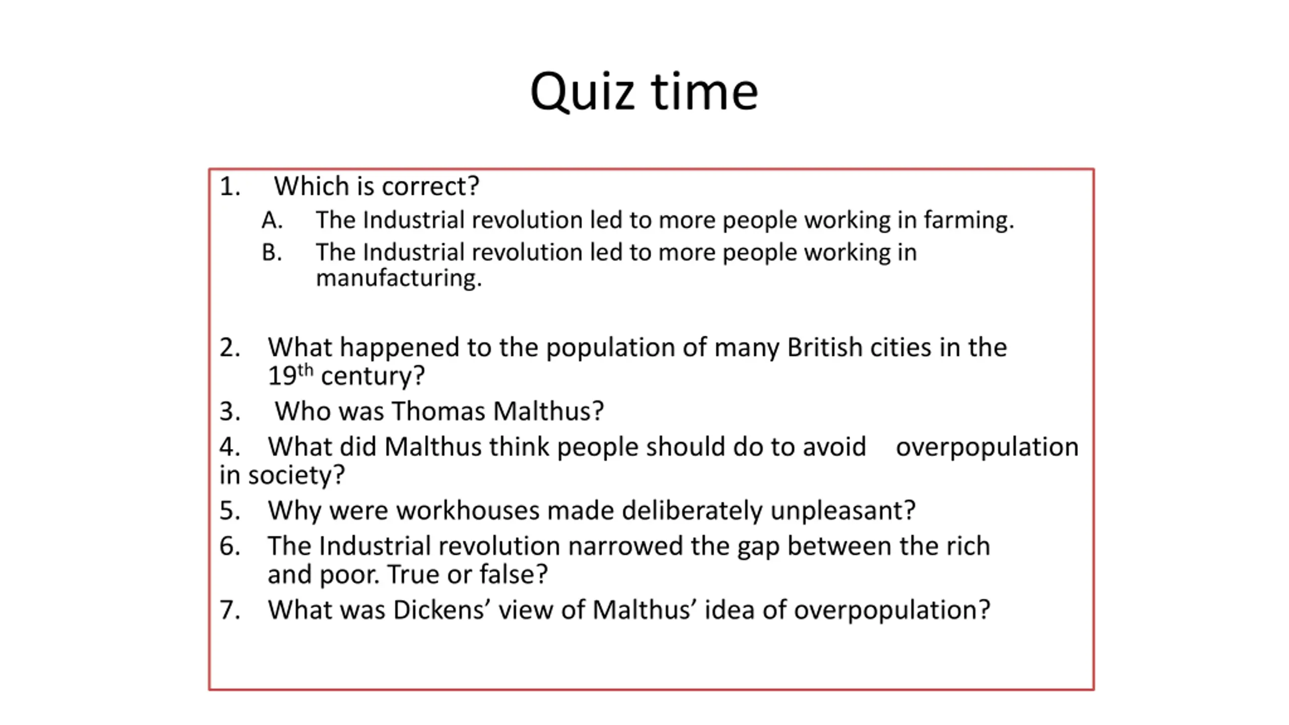 Quiz time 1. Which is correct? A. The Industrial revolution led to more people working in farming. B. The Industrial revolution led to more people working in manufacturing. 2. What happened to the population of many British cities in the 19th century? 3. Who was Thomas Malthus? 4. What did Malthus think people should do to avoid overpopulation in society? 5. Why were workhouses made deliberately unpleasant? 6. The Industrial revolution narrowed the gap between the rich and poor. True or false? 7. What was Dickens view of Malthus idea of overpopulation?