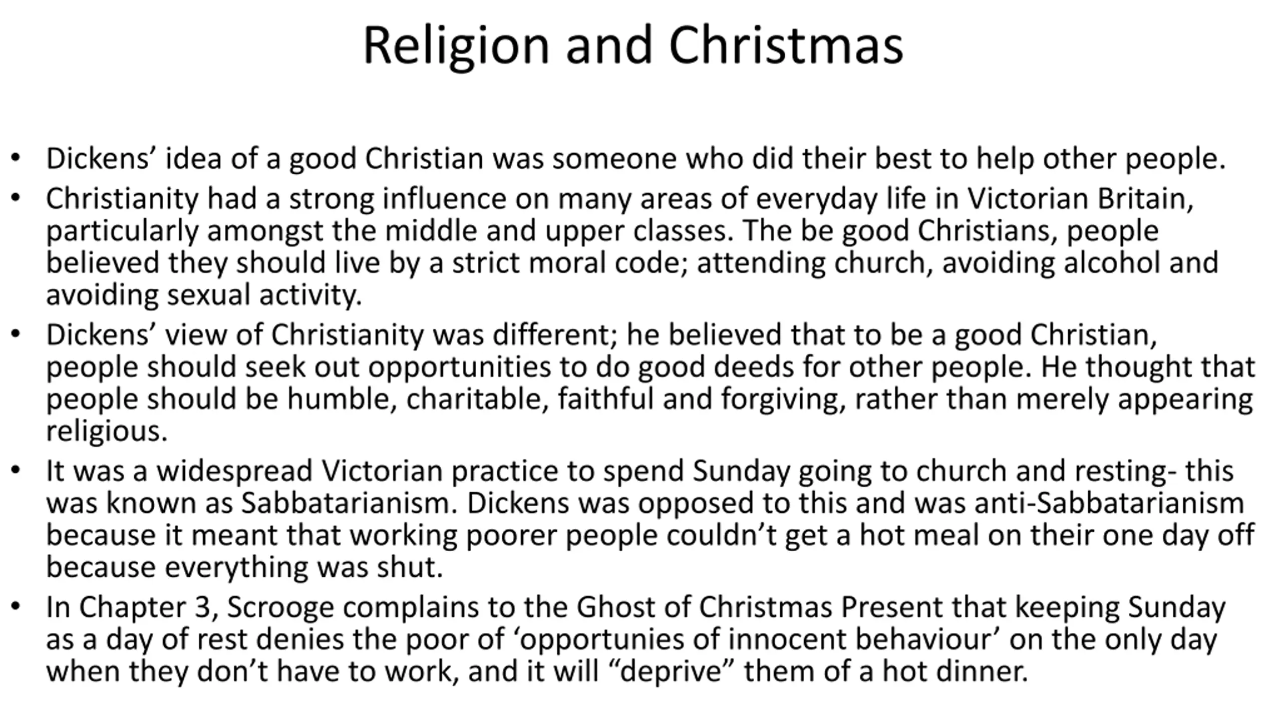 Religion and Christmas Dickens idea of a good Christian was someone who did their best to help other people. Christianity had a strong influence on many areas of everyday life in Victorian Britain, particularly amongst the middle and upper classes. The be good Christians, people believed they should live by a strict moral code; attending church, avoiding alcohol and avoiding sexual activity. Dickens view of Christianity was different; he believed that to be a good Christian, people should seek out opportunities to do good deeds for other people. He thought that people should be humble, charitable, faithful and forgiving, rather than merely appearing religious. It was a widespread Victorian practice to spend Sunday going to church and resting- this was known as Sabbatarianism. Dickens was opposed to this and was anti-Sabbatarianism because it meant that working poorer people couldn t get a hot meal on their one day off because everything was shut. In Chapter 3, Scrooge complains to the Ghost of Christmas Present that keeping Sunday as a day of rest denies the poor of opportunies of innocent behaviour on the only day when they don t have to work, and it will deprive them of a hot dinner.