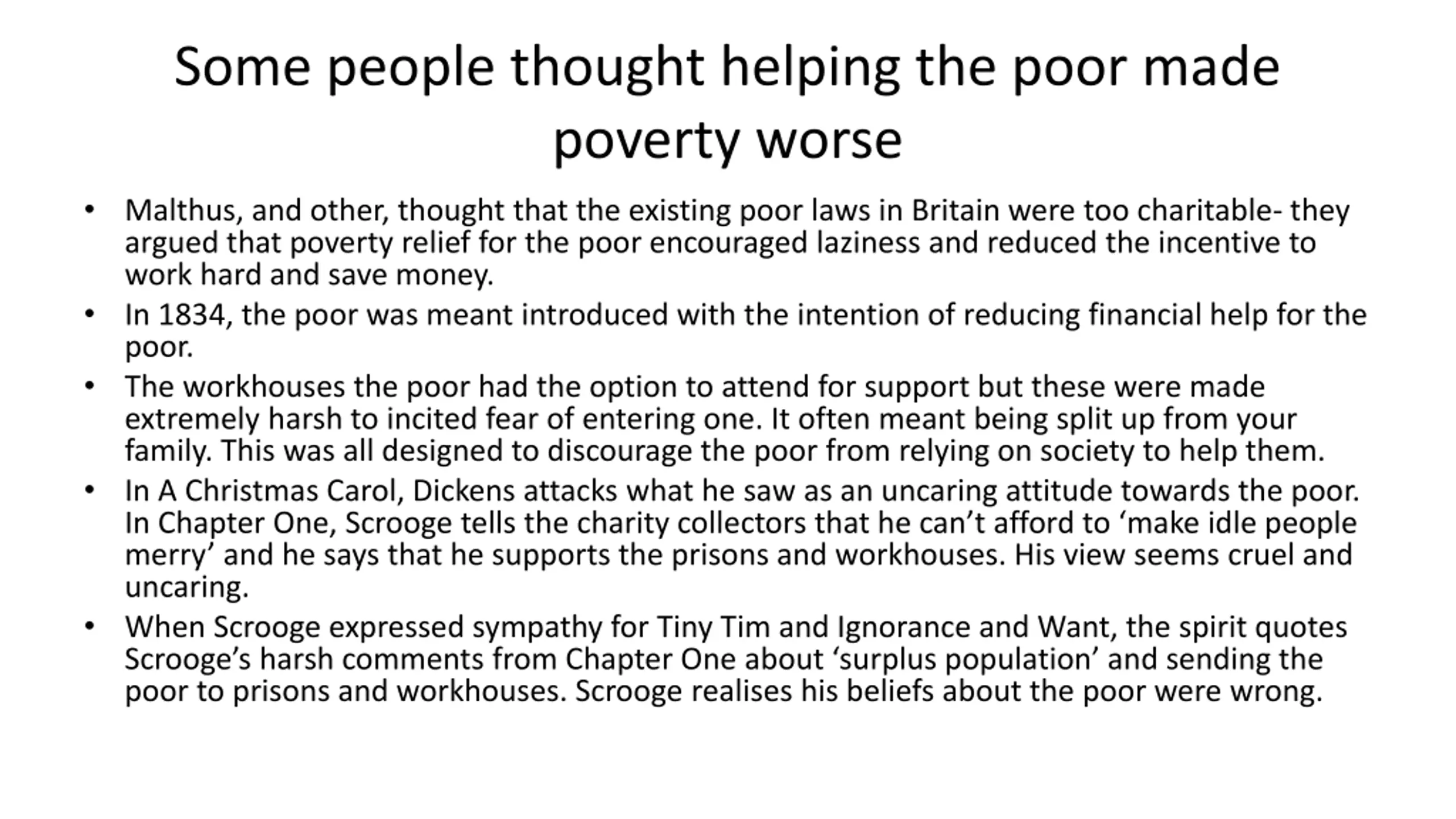 Some people thought helping the poor made poverty worse Malthus, and other, thought that the existing poor laws in Britain were too charitable- they argued that poverty relief for the poor encouraged laziness and reduced the incentive to work hard and save money. In 1834, the poor was meant introduced with the intention of reducing financial help for the poor. The workhouses the poor had the option to attend for support but these were made extremely harsh to incited fear of entering one. It often meant being split up from your family. This was all designed to discourage the poor from relying on society to help them. In A Christmas Carol, Dickens attacks what he saw as an uncaring attitude towards the poor. In Chapter One, Scrooge tells the charity collectors that he can t afford to make idle people merry and he says that he supports the prisons and workhouses. His view seems cruel and uncaring. When Scrooge expressed sympathy for Tiny Tim and Ignorance and Want, the spirit quotes Scrooge s harsh comments from Chapter One about surplus population and sending the poor to prisons and workhouses. Scrooge realises his beliefs about the poor were wrong.
