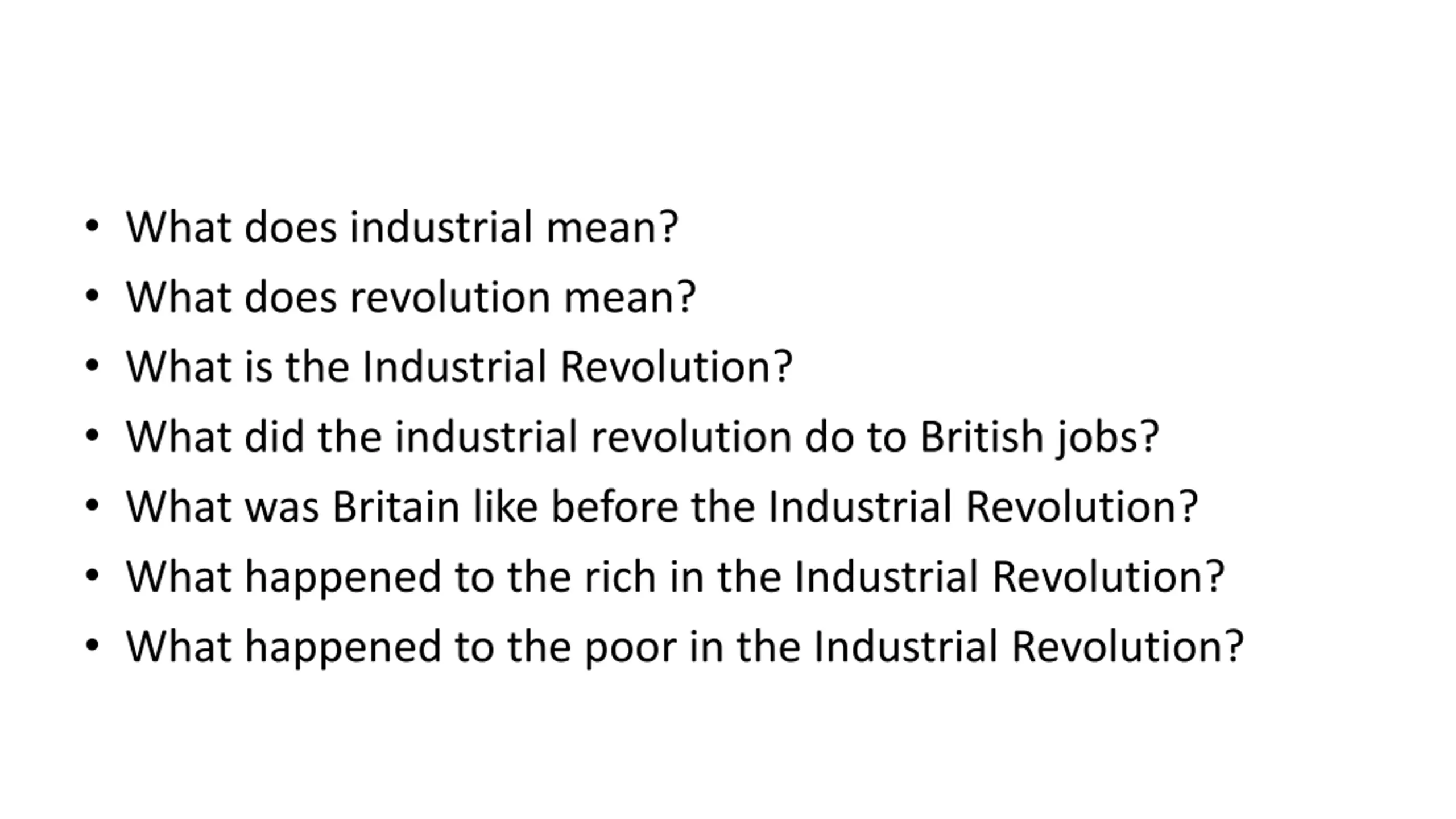 What does industrial mean? What does revolution mean? What is the Industrial Revolution? What did the industrial revolution do to British jobs? What was Britain like before the Industrial Revolution? What happened to the rich in the Industrial Revolution? What happened to the poor in the Industrial Revolution?