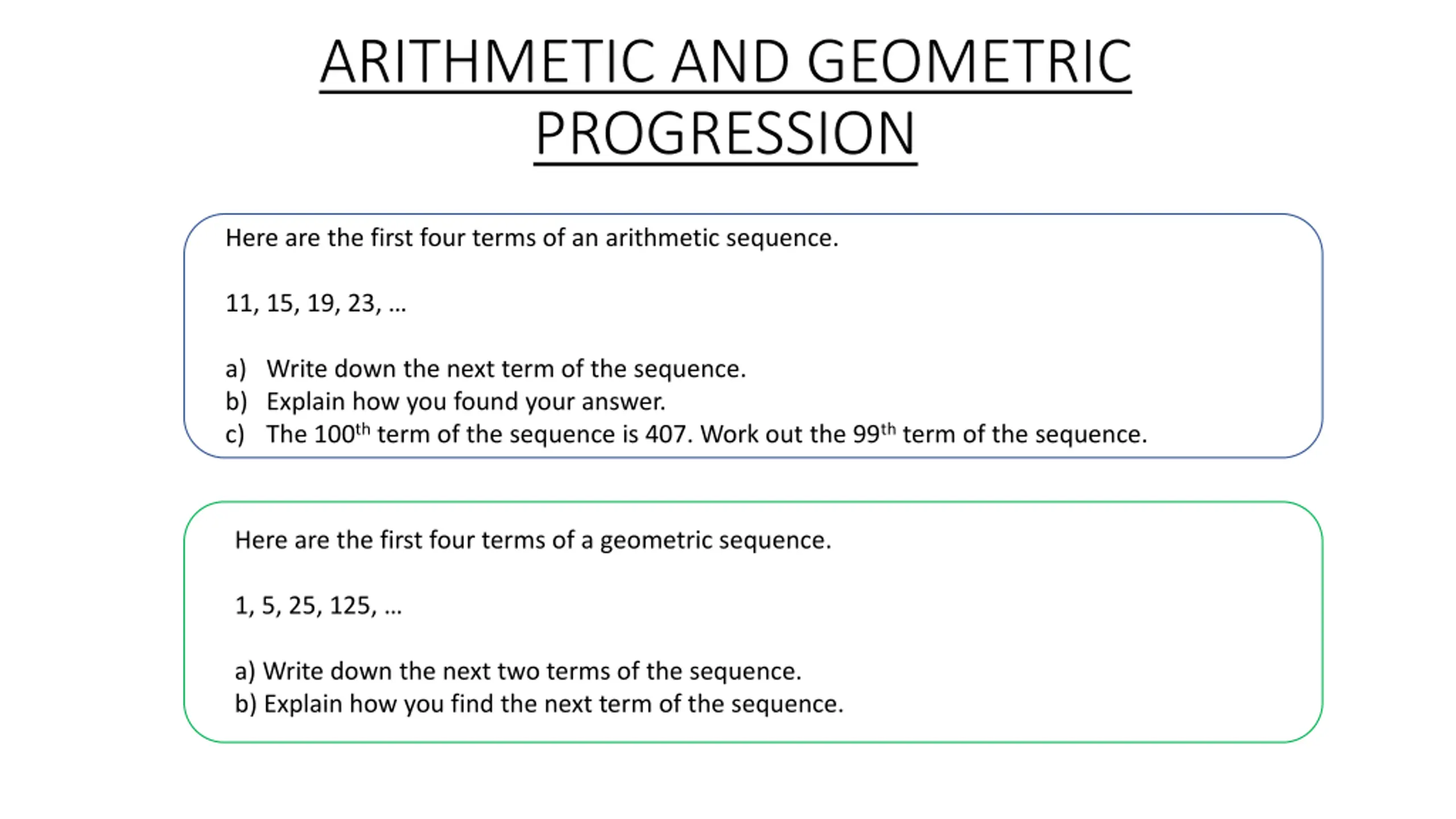 ARITHMETIC AND GEOMETRIC PROGRESSION Here are the first four terms of an arithmetic sequence. 11, 15, 19, 23, a) Write down the next term of the sequence. b) Explain how you found your answer. c) The 100th term of the sequence is 407. Work out the 99th term of the sequence. Here are the first four terms of a geometric sequence. 1, 5, 25, 125, a) Write down the next two terms of the sequence. b) Explain how you find the next term of the sequence.