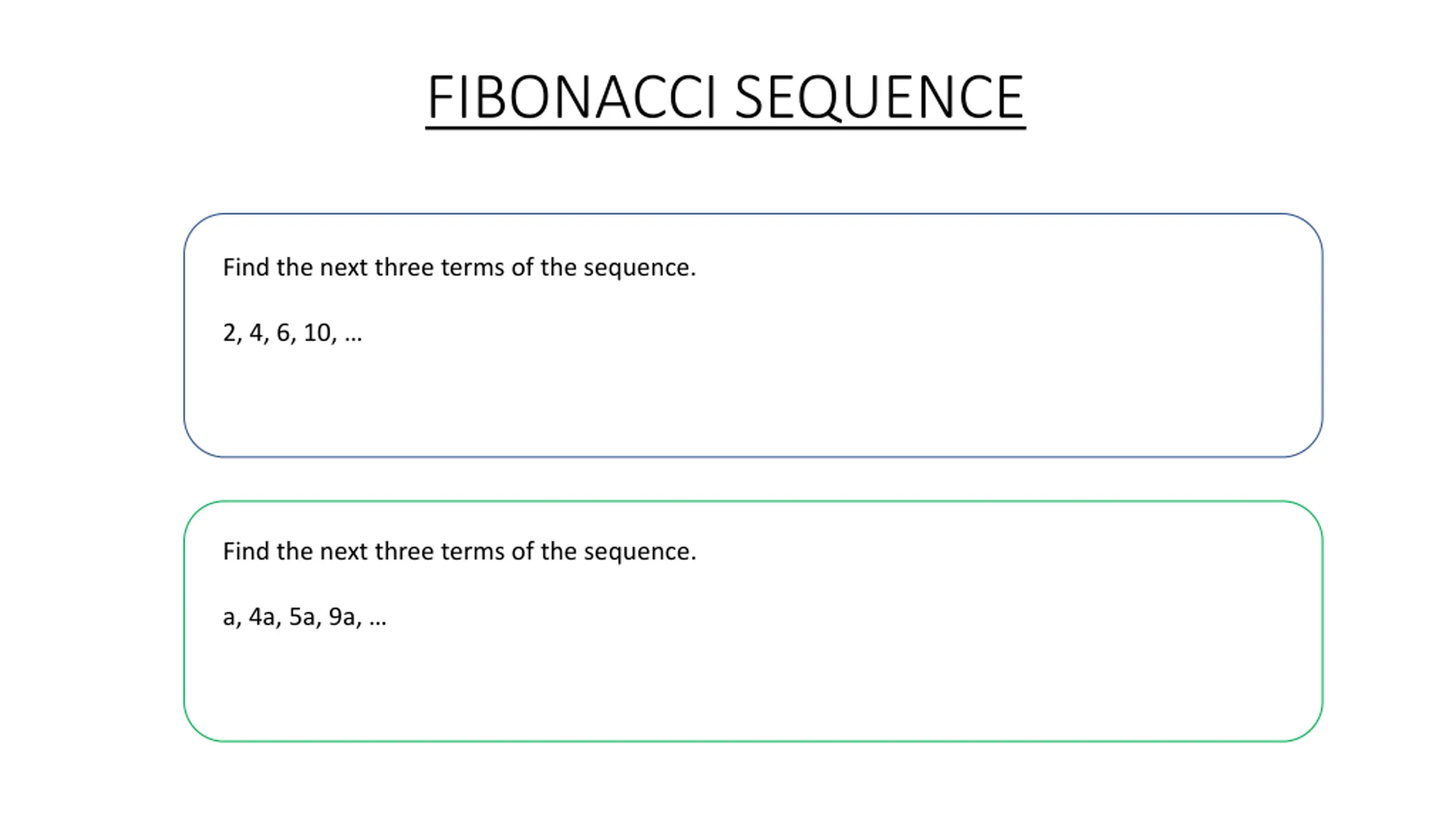 FIBONACCI SEQUENCE Find the next three terms of the sequence. 2, 4, 6, 10, Find the next three terms of the sequence. a, 4a, 5a, 9a,