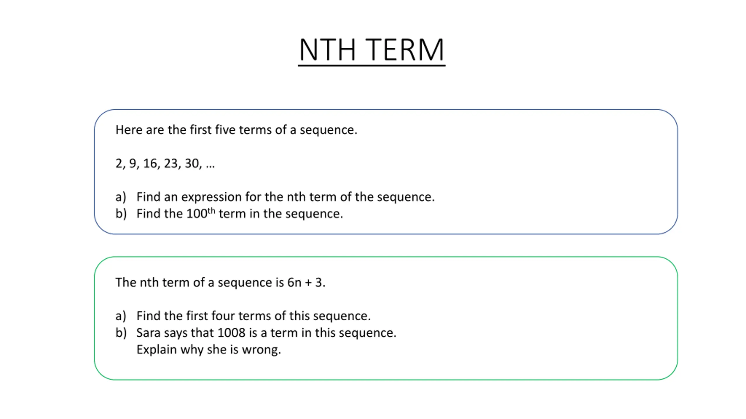 NTH TERM Here are the first five terms of a sequence. 2, 9, 16, 23, 30, a) Find an expression for the nth term of the sequence. b) Find the 100th term in the sequence. The nth term of a sequence is 6n + 3. a) Find the first four terms of this sequence. b) Sara says that 1008 is a term in this sequence. Explain why she is wrong.