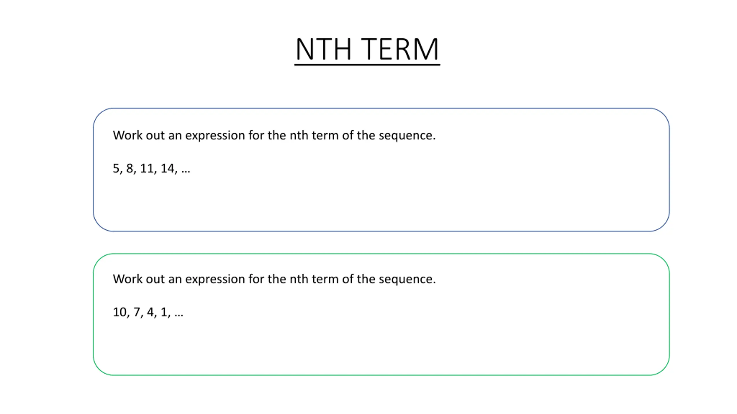 NTH TERM Work out an expression for the nth term of the sequence. 5, 8, 11, 14, Work out an expression for the nth term of the sequence. 10, 7, 4, 1,