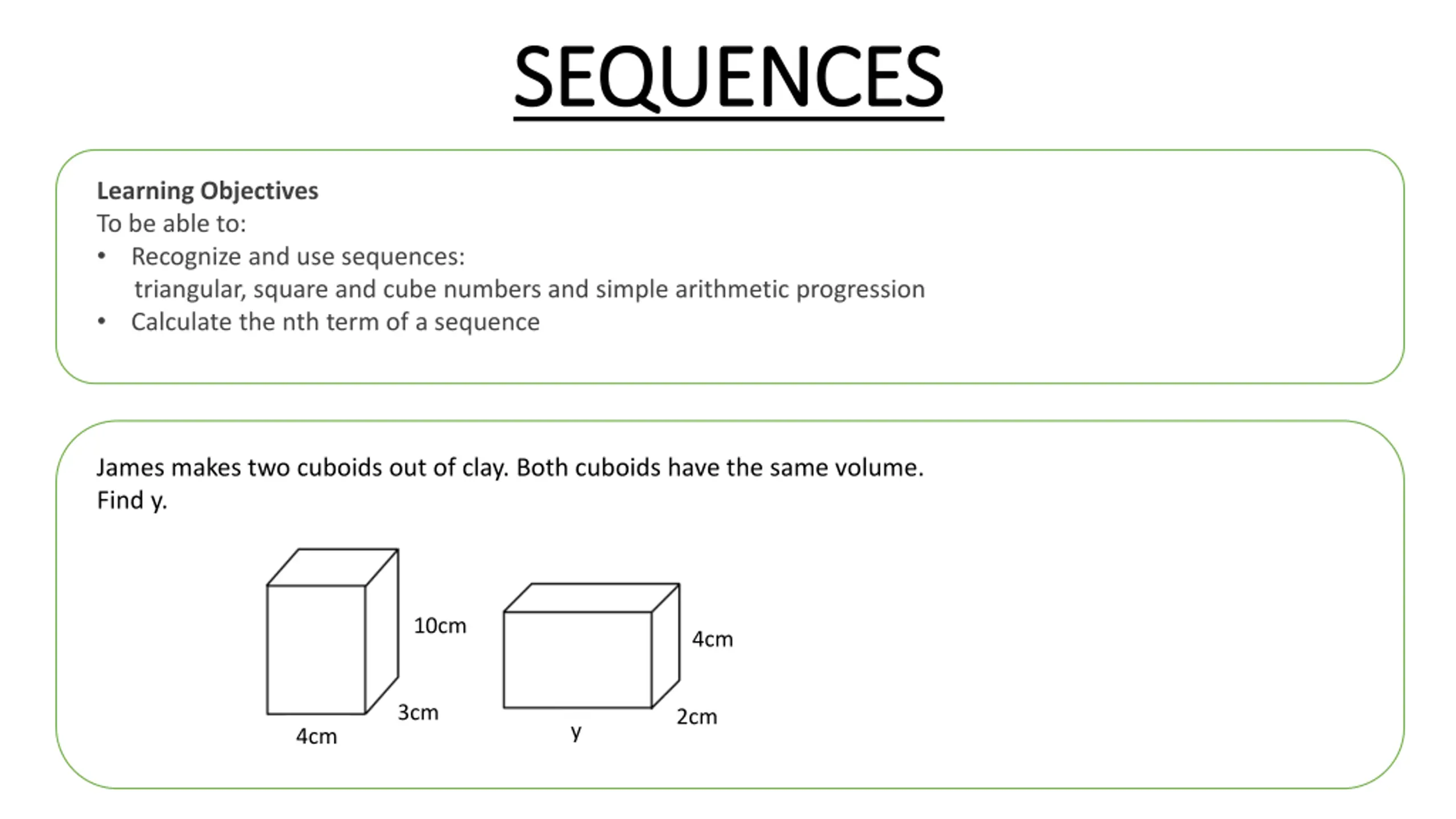 SEQUENCES SEQUENCES Learning Objectives To be able to: Recognize and use sequences: triangular, square and cube numbers and simple arithmetic progression Calculate the nth term of a sequence James makes two cuboids out of clay. Both cuboids have the same volume. Find y. 10cm 4cm 3cm 2cm y 4cm