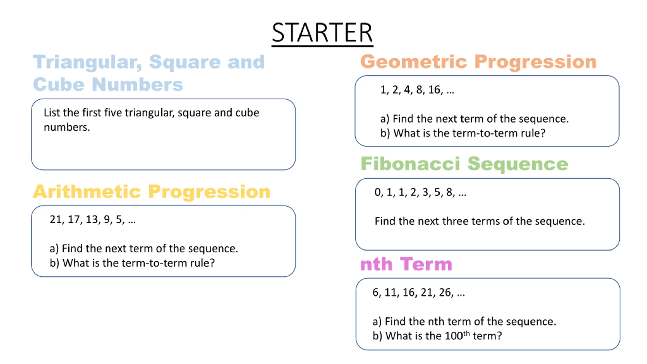 STARTER Geometric Progression Triangular, Square and Cube Numbers 1, 2, 4, 8, 16, List the first five triangular, square and cube numbers. a) Find the next term of the sequence. b) What is the term-to-term rule? Fibonacci Sequence Arithmetic Progression 0, 1, 1, 2, 3, 5, 8, 21, 17, 13, 9, 5, Find the next three terms of the sequence. a) Find the next term of the sequence. b) What is the term-to-term rule? nth Term 6, 11, 16, 21, 26, a) Find the nth term of the sequence. b) What is the 100th term?