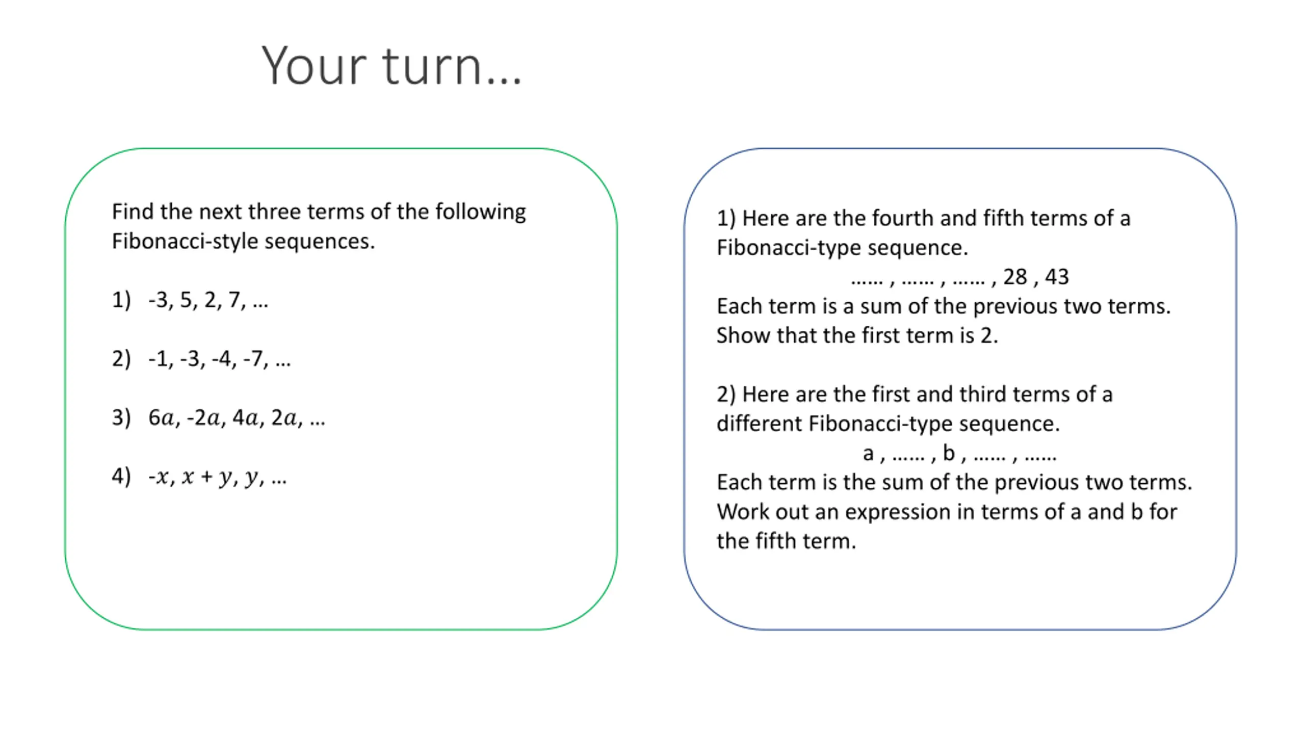 Your turn Find the next three terms of the following Fibonacci-style sequences. 1) Here are the fourth and fifth terms of a Fibonacci-type sequence. , , , 28 , 43 Each term is a sum of the previous two terms. Show that the first term is 2. 1) -3, 5, 2, 7, 2) -1, -3, -4, -7, 2) Here are the first and third terms of a different Fibonacci-type sequence. a , , b , , Each term is the sum of the previous two terms. Work out an expression in terms of a and b for the fifth term. 3) 6?, -2?, 4?, 2?, 4) -?, ? + ?, ?,