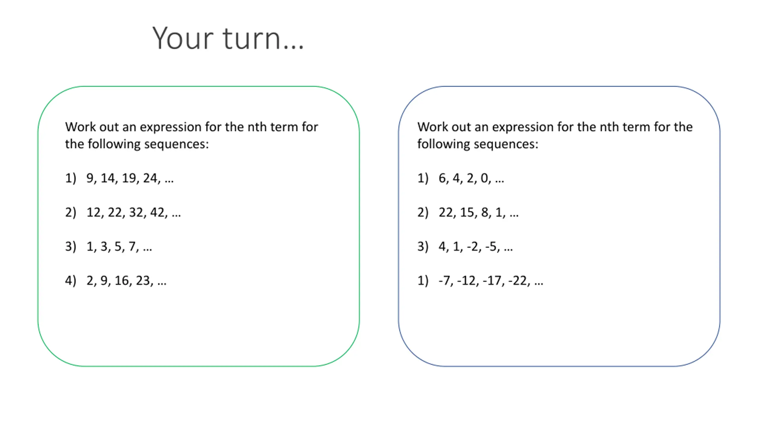 Your turn Work out an expression for the nth term for the following sequences: Work out an expression for the nth term for the following sequences: 1) 9, 14, 19, 24, 1) 6, 4, 2, 0, 2) 12, 22, 32, 42, 2) 22, 15, 8, 1, 3) 1, 3, 5, 7, 3) 4, 1, -2, -5, 4) 2, 9, 16, 23, 1) -7, -12, -17, -22,