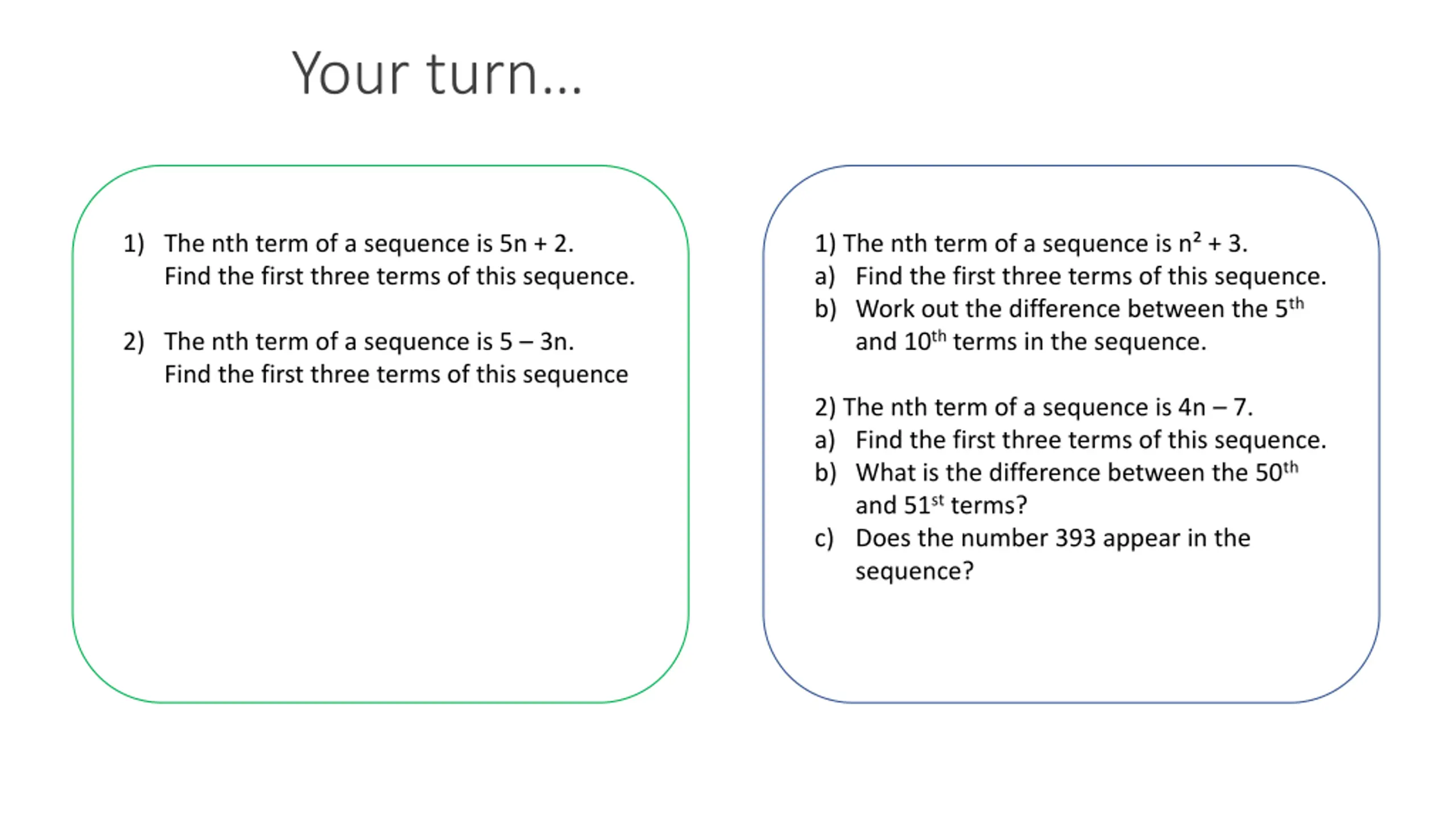 Your turn 1) The nth term of a sequence is 5n + 2. Find the first three terms of this sequence. 1) The nth term of a sequence is n + 3. a) Find the first three terms of this sequence. b) Work out the difference between the 5th and 10th terms in the sequence. 2) The nth term of a sequence is 5 3n. Find the first three terms of this sequence 2) The nth term of a sequence is 4n 7. a) Find the first three terms of this sequence. b) What is the difference between the 50th and 51st terms? c) Does the number 393 appear in the sequence?