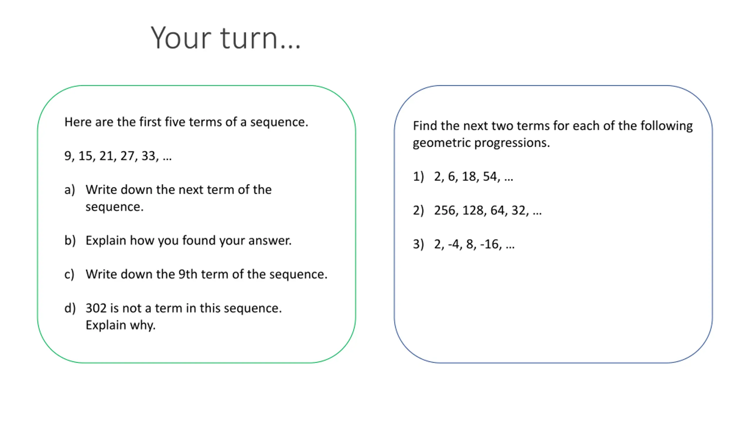 Your turn Here are the first five terms of a sequence. Find the next two terms for each of the following geometric progressions. 9, 15, 21, 27, 33, 1) 2, 6, 18, 54, a) Write down the next term of the sequence. 2) 256, 128, 64, 32, b) Explain how you found your answer. 3) 2, -4, 8, -16, c) Write down the 9th term of the sequence. d) 302 is not a term in this sequence. Explain why.