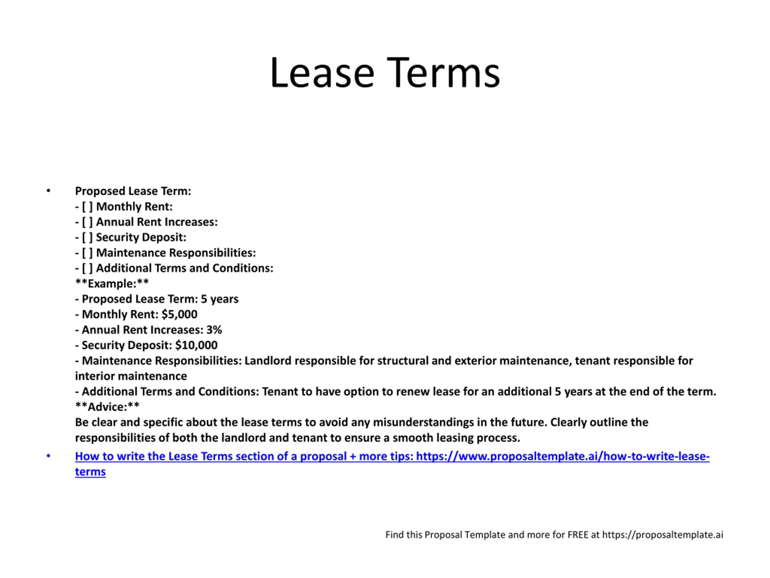 Lease Terms Proposed Lease Term: - [ ] Monthly Rent: - [ ] Annual Rent Increases: - [ ] Security Deposit: - [ ] Maintenance Responsibilities: - [ ] Additional Terms and Conditions: **Example:** - Proposed Lease Term: 5 years - Monthly Rent: $5,000 - Annual Rent Increases: 3% - Security Deposit: $10,000 - Maintenance Responsibilities: Landlord responsible for structural and exterior maintenance, tenant responsible for interior maintenance - Additional Terms and Conditions: Tenant to have option to renew lease for an additional 5 years at the end of the term. **Advice:** Be clear and specific about the lease terms to avoid any misunderstandings in the future. Clearly outline the responsibilities of both the landlord and tenant to ensure a smooth leasing process. How to write the Lease Terms section of a proposal + more tips: https://www.proposaltemplate.ai/how-to-write-lease- terms Find this Proposal Template and more for FREE at https://proposaltemplate.ai