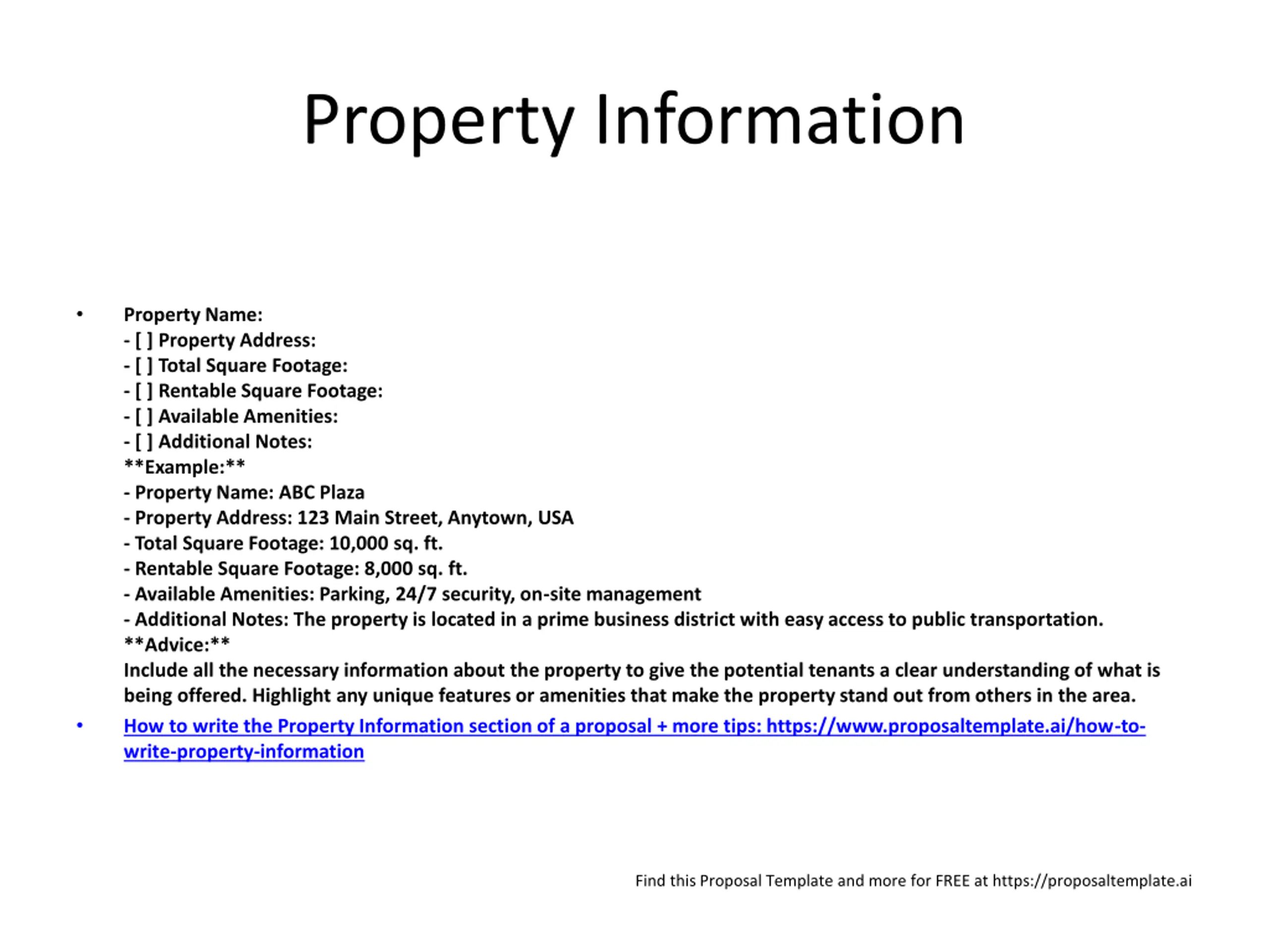 Property Information Property Name: - [ ] Property Address: - [ ] Total Square Footage: - [ ] Rentable Square Footage: - [ ] Available Amenities: - [ ] Additional Notes: **Example:** - Property Name: ABC Plaza - Property Address: 123 Main Street, Anytown, USA - Total Square Footage: 10,000 sq. ft. - Rentable Square Footage: 8,000 sq. ft. - Available Amenities: Parking, 24/7 security, on-site management - Additional Notes: The property is located in a prime business district with easy access to public transportation. **Advice:** Include all the necessary information about the property to give the potential tenants a clear understanding of what is being offered. Highlight any unique features or amenities that make the property stand out from others in the area. How to write the Property Information section of a proposal + more tips: https://www.proposaltemplate.ai/how-to- write-property-information Find this Proposal Template and more for FREE at https://proposaltemplate.ai