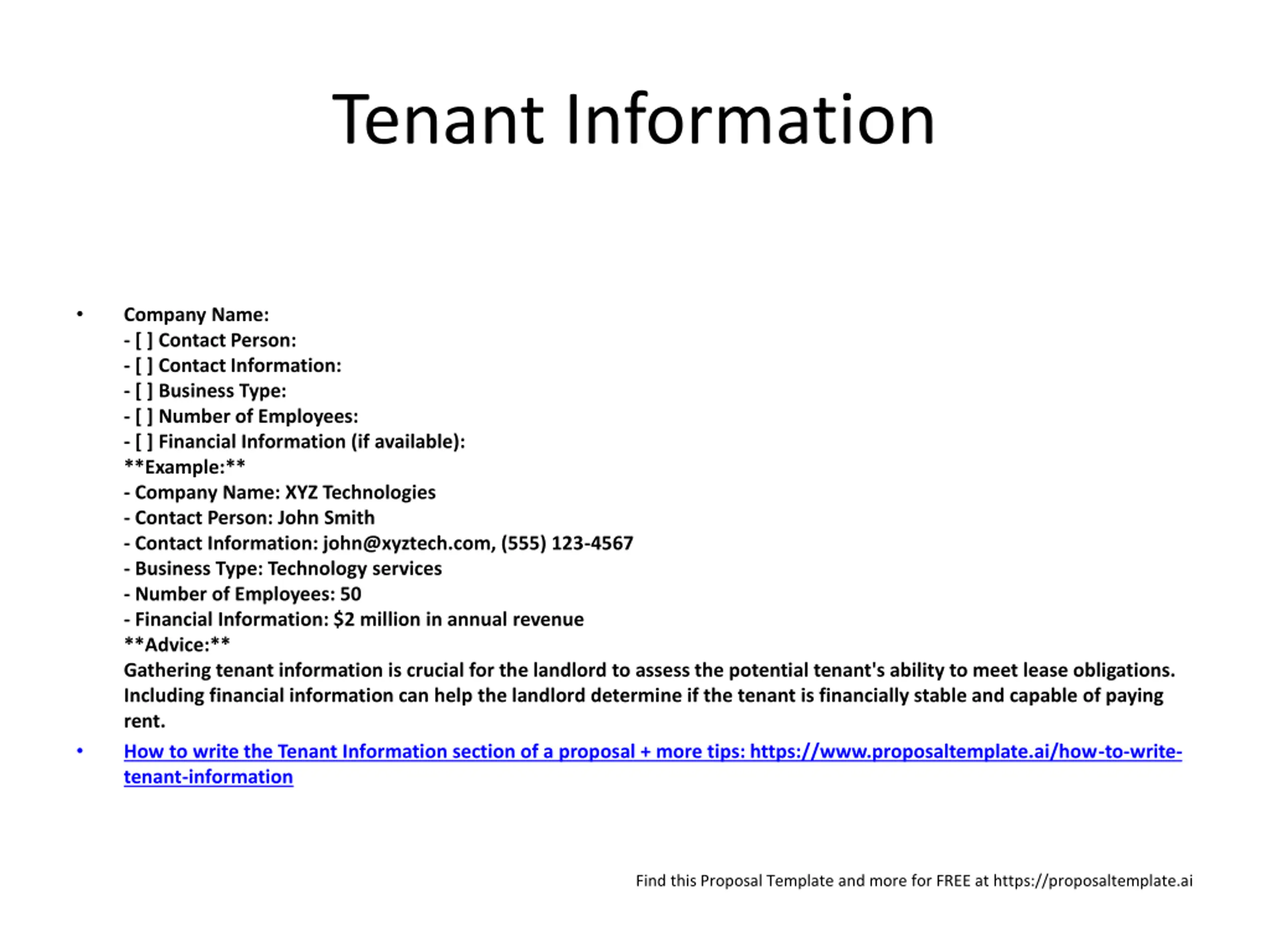 Tenant Information Company Name: - [ ] Contact Person: - [ ] Contact Information: - [ ] Business Type: - [ ] Number of Employees: - [ ] Financial Information (if available): **Example:** - Company Name: XYZ Technologies - Contact Person: John Smith - Contact Information: john@xyztech.com, (555) 123-4567 - Business Type: Technology services - Number of Employees: 50 - Financial Information: $2 million in annual revenue **Advice:** Gathering tenant information is crucial for the landlord to assess the potential tenant's ability to meet lease obligations. Including financial information can help the landlord determine if the tenant is financially stable and capable of paying rent. How to write the Tenant Information section of a proposal + more tips: https://www.proposaltemplate.ai/how-to-write- tenant-information Find this Proposal Template and more for FREE at https://proposaltemplate.ai